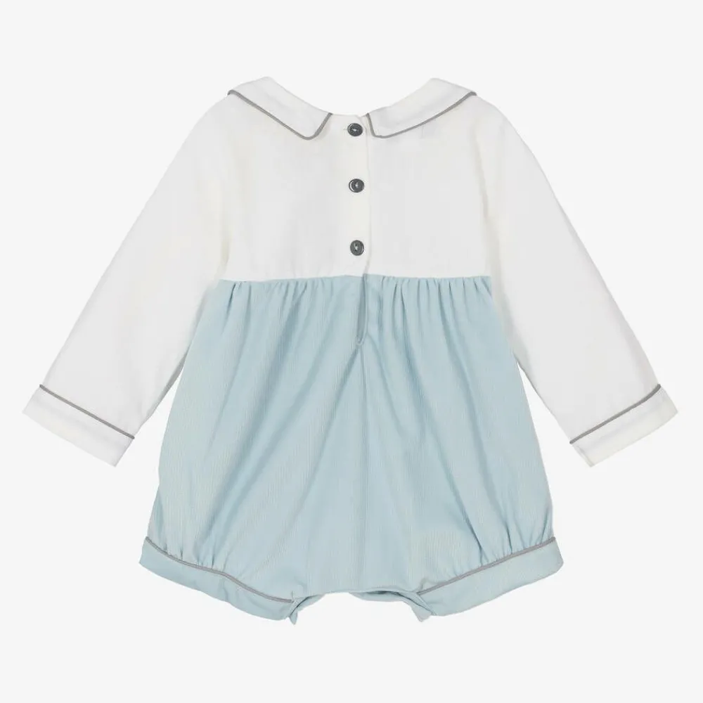 Blue and ivory shortie for baby boys by Beau KiD. The ivory top and long sleeves have a ribbed design with pintucks and a cute embroidered bear on the front. There is a smart collar trimmed with grey piping to match the piping on the cuffs. The bottom part of the shortie is blue with a textured waffle effect and brushed feel. It has matching grey trims and pleats on the front with navy blue button trims. This lovely traditional piece fastens with buttons on the back and poppers between the legs.