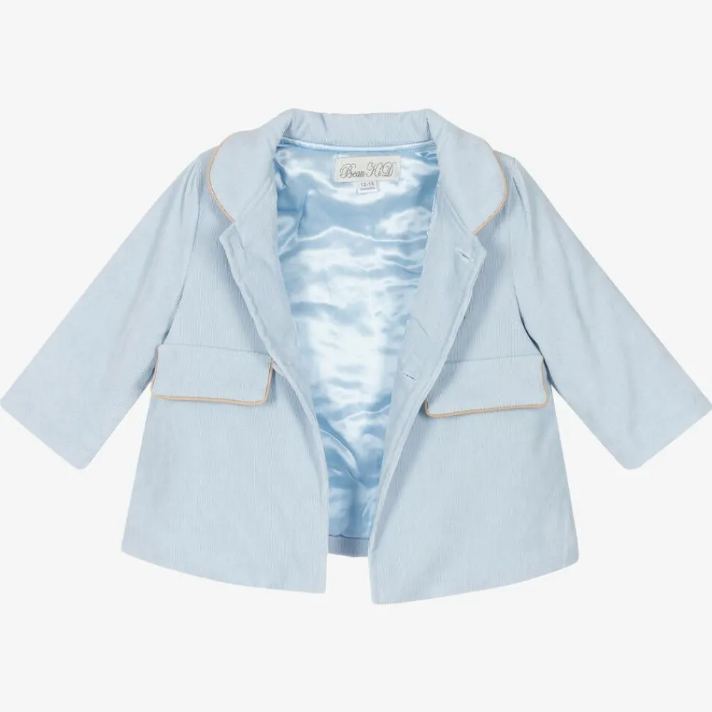 Pale blue with beige trims, this traditionally styled coat and cap set for baby boys is by Beau KiD. Made in soft fine corduroy, the coat is lined in silky satin and the flat cap in lightweight voile with an elasticated back. The coat is lightly padded for warmth and has faux flap pockets and front button fastenings. There are stylish elbow patches, with a sweet embroidered teddy on the chest adding a cute and classic touch.