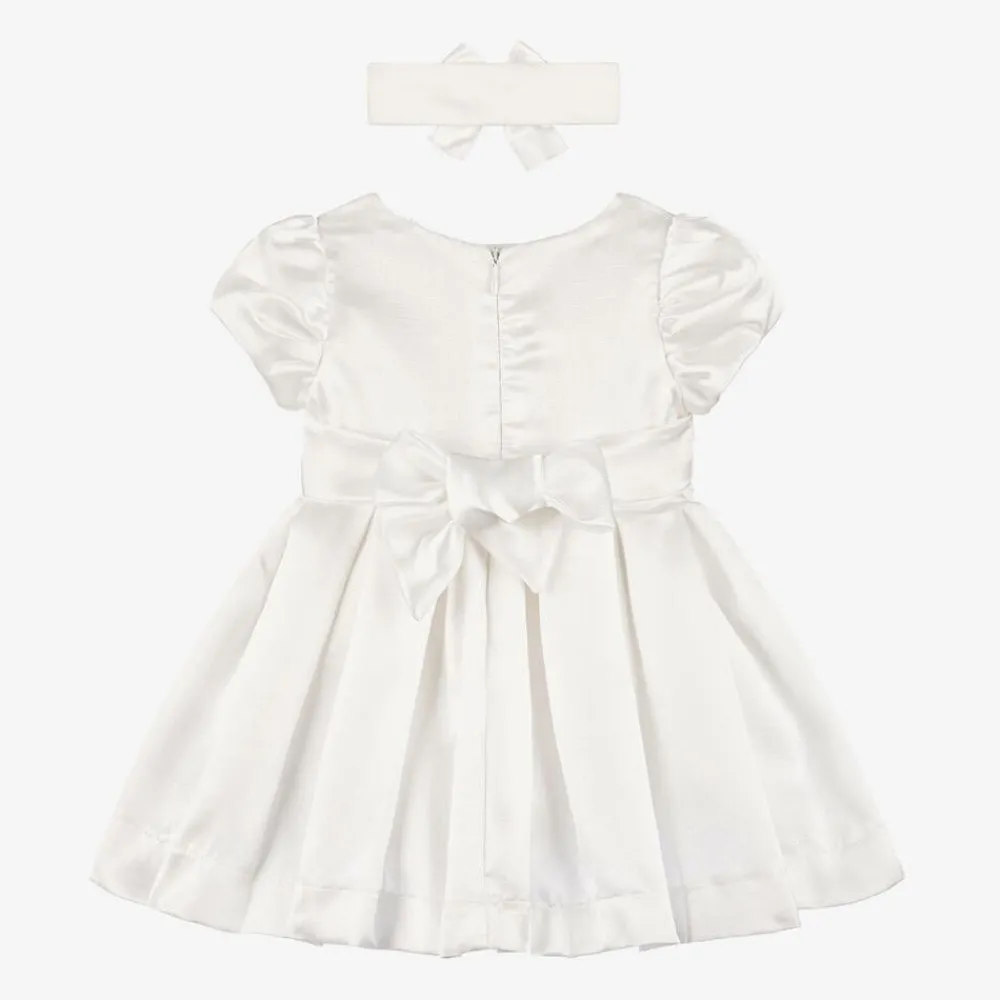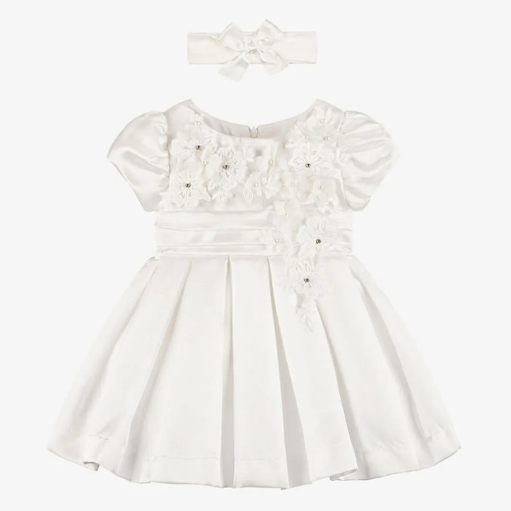 Designed with a lustrous sheen, this beautiful ivory dress set for baby girls by Beau KiD, is made in silky satin. This lovely, special occasion dress has gorgeous floral appliqués decorating the bodice, with faux pearl and silver bead detailing. It has puffed short sleeves and a full, pleated skirt, with a concealed zip to fasten on the back, along with a sash to tie in a bow. A cotton blend lining provides long lasting comfort, with a tulle trim adding volume to the skirt. To complete the sweet look, the dress comes with a stretchy headband trimmed with a satin bow.