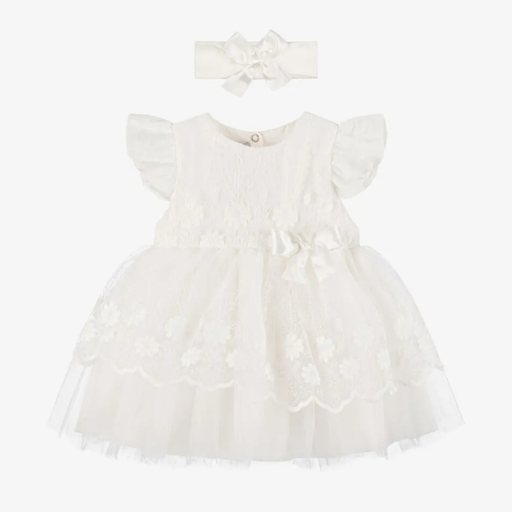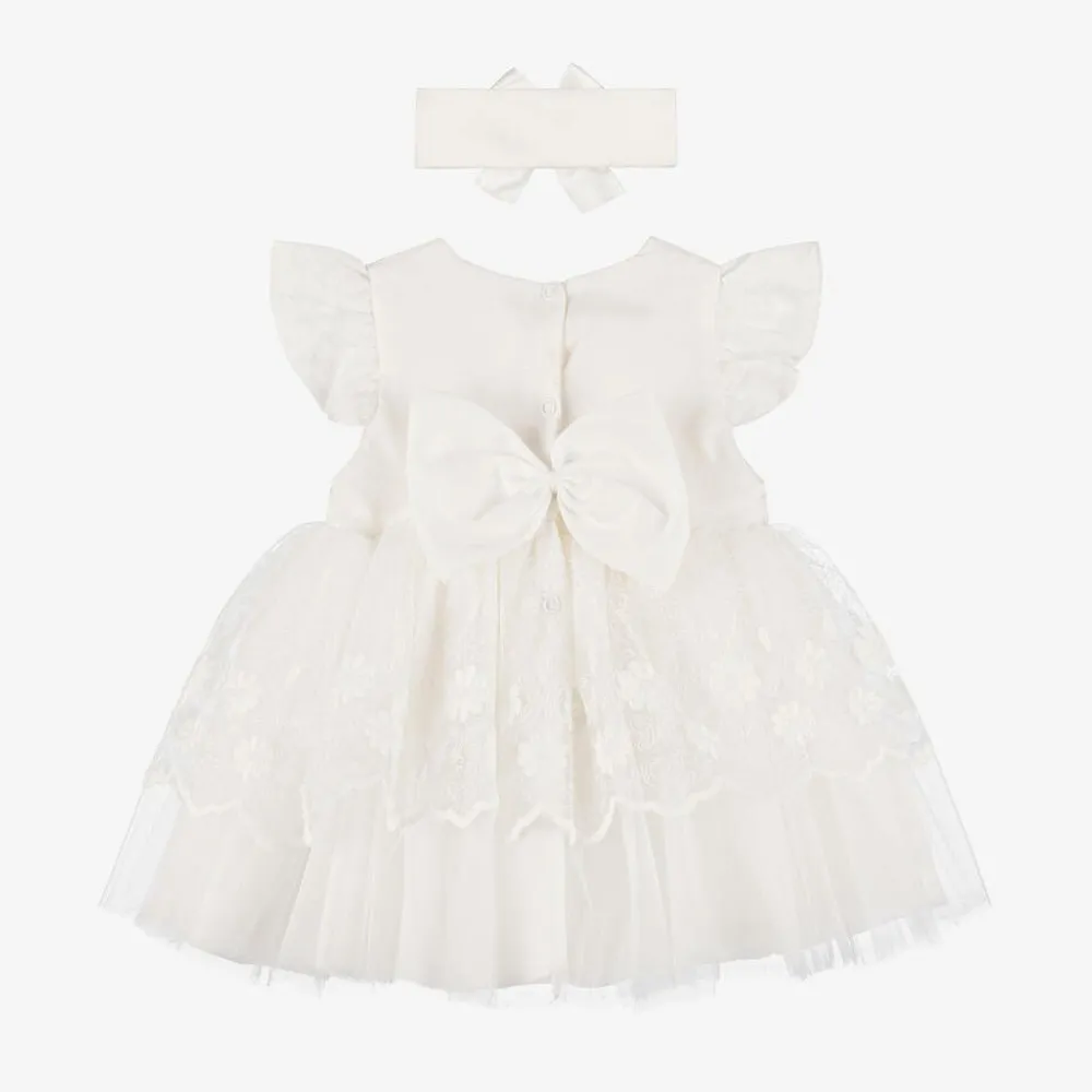 A beautiful ivory special occasion dress for baby girls by Beau KiD. Made from layers of lightweight tulle, it has a floral-embroidered tulle overlayer with scalloped edging for a sweet and delicate look. It has a silky underlayer and a smooth woven cotton-blended lining for extra comfort. Fastening with poppers, there is an appliqué satin ribbon bow on the front, frilled short sleeves, and a detachable bow brooch that can be secured with a safety pin on the back for a delightful finish. A coordinating headband completes this elegant style.