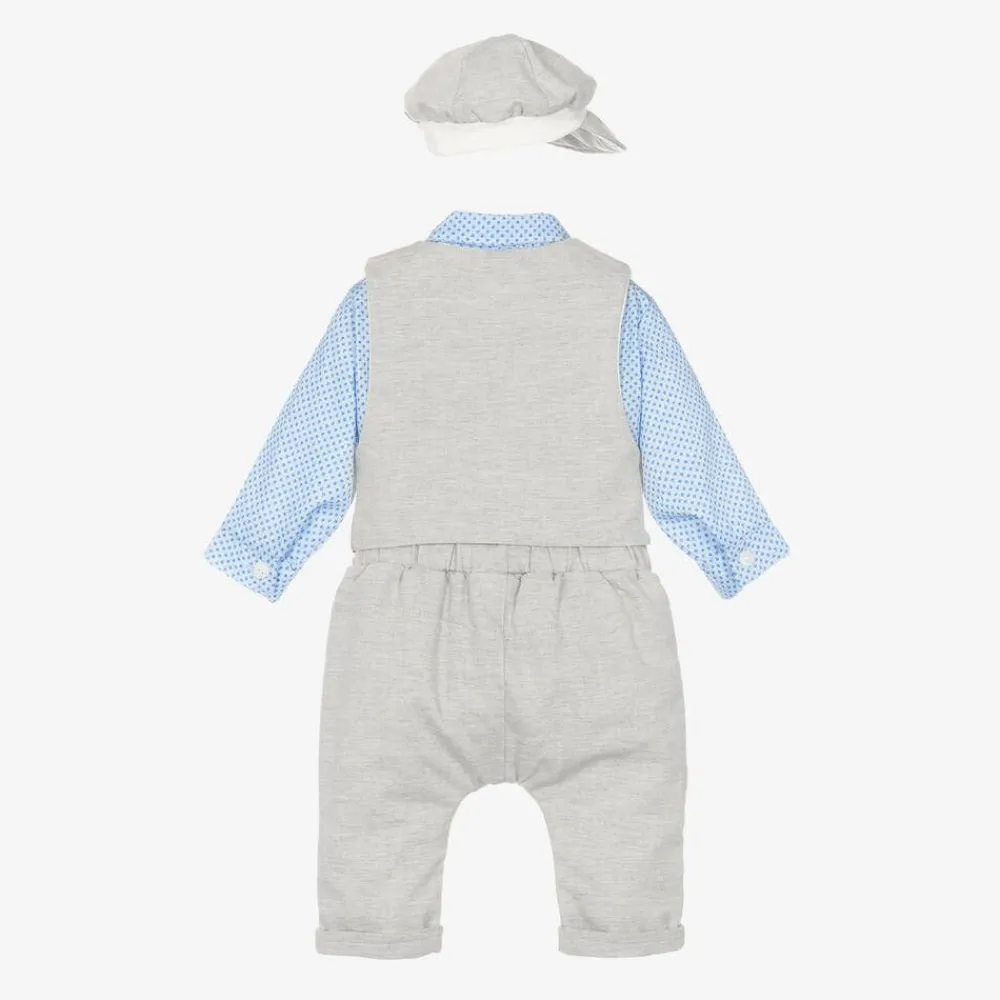 A charming grey and blue trouser set for baby boys by Beau KiD. Made from smooth cotton twill with a lightweight lining, the button-fastened waistcoat has a faux pocket and handkerchief detail, the trousers have a stretchy waistband and curved pockets, and the sweet hat has an ivory jersey trim. The smart shirt-style woven cotton bodysuit is printed with a tiny geometric pattern and has a fixed bowtie embellishment. It fastens with pearlescent buttons on the front and the cuffs and has poppers between the legs to make dressing easier. The outfit is completed by some navy blue and white striped braces that are elasticated and adjustable and clip easily to the trousers.