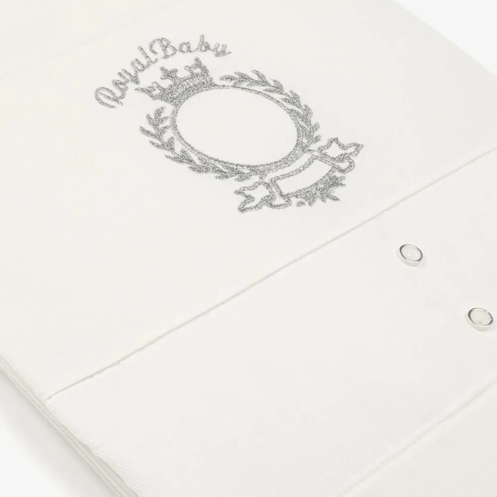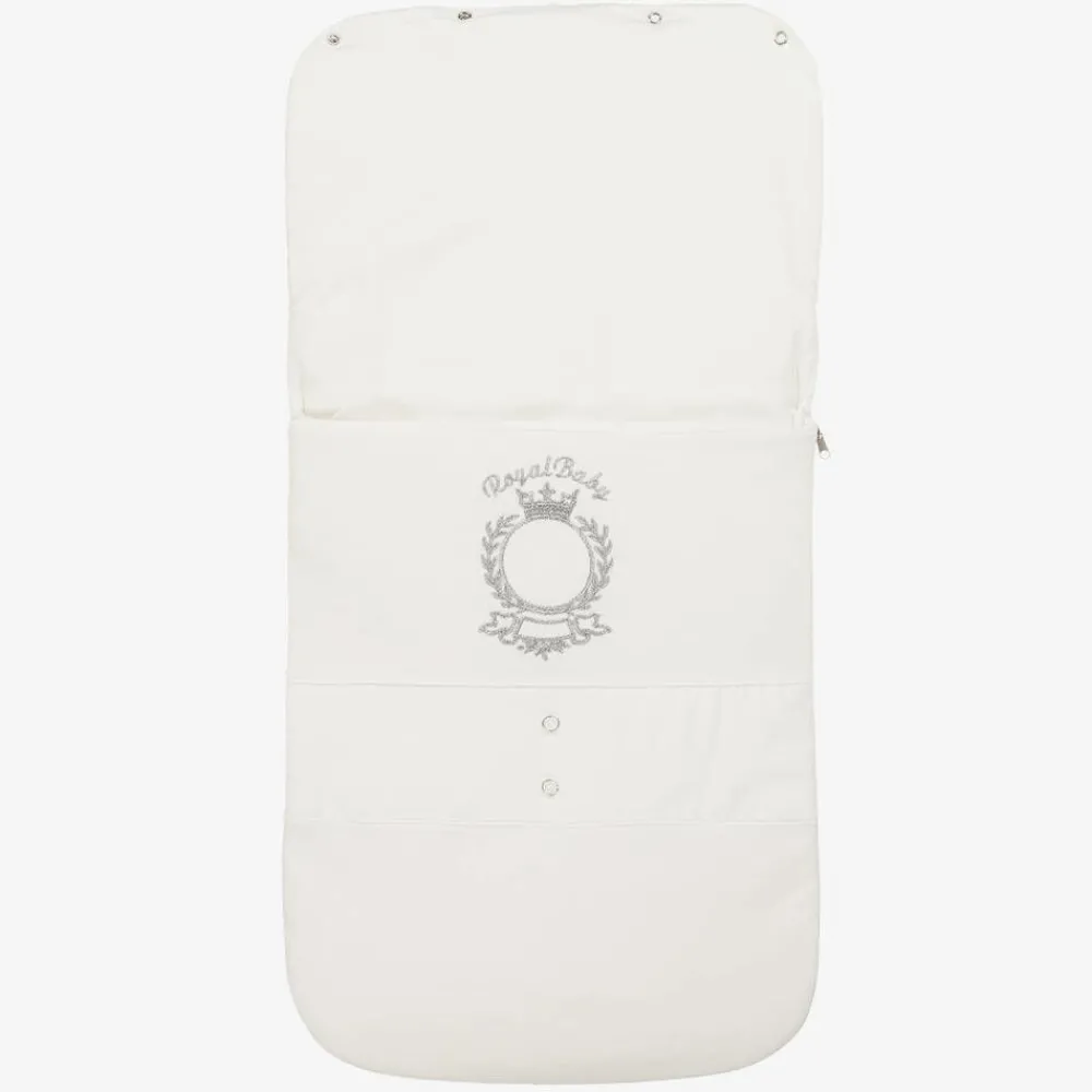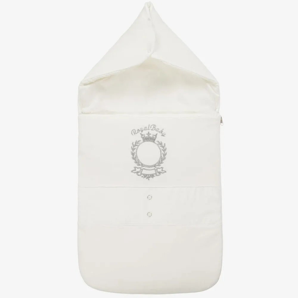 A lovely ivory nest for baby boys and girls by Beau KiD. Made from soft cotton-blended waffle jersey with smooth jersey panels, this lightly padded nest has a smooth woven lining. Embroidered on the front is a sparkly silver 'Royal Baby' crest design, alongside button decorations for a sweet look. Fastening with a zip that reaches from one side to the other for easy access, it has a popper-fastened pointed hood that can be laid flat for extra comfort.