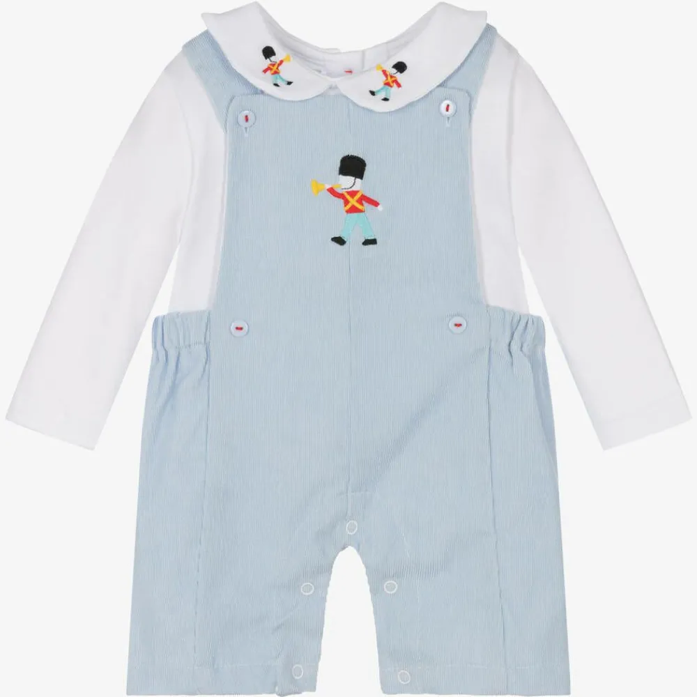 Baby boys dungaree shorts and top set by Beau KiD. The lined shorts are made in soft cotton corduroy and have an embroidered toy soldier on the front, with button fastening shoulder straps and elasticated side panels. They have popper fastenings between the legs for easy dressing and changing. They come with a white cotton jersey top that has a rounded collar with matching embroidery and back popper fastenings.