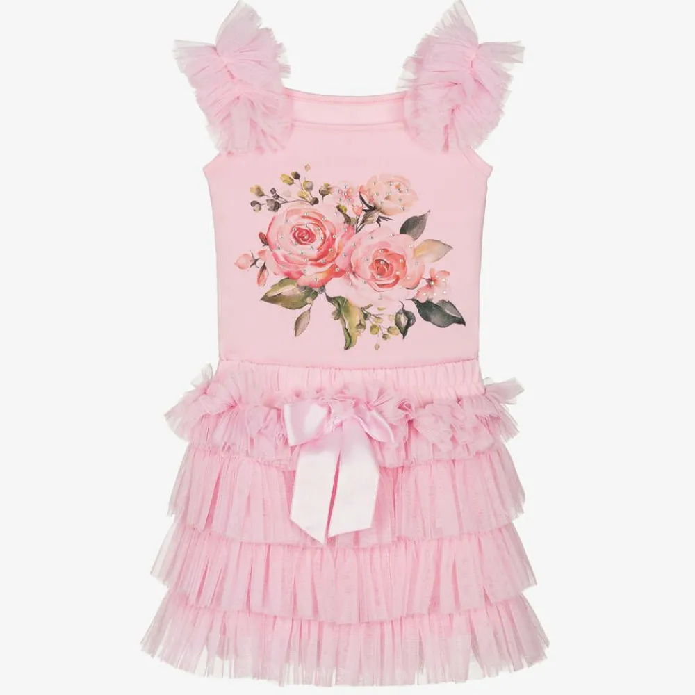 Girls pink skirt and top set from Beau KiD. The skirt is made in soft tulle ruffles, with a cotton jersey lining and elasticated waistband. The cotton jersey top has matching tulle ruffles on the shoulder straps and a floral print with diamanté detail.