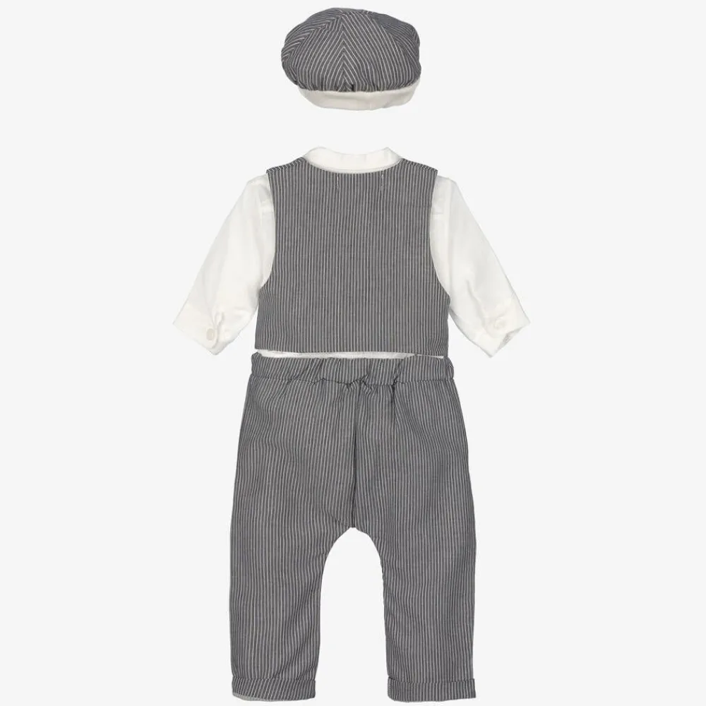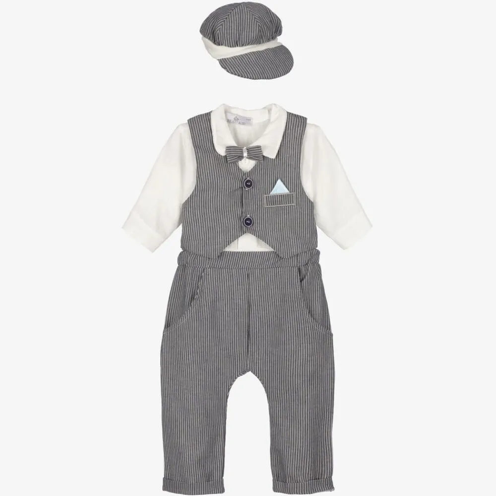 A smart grey and white outfit for baby boys by Beau KiD, made in soft cotton. For a complete look, the set consists of a white bodysuit-style shirt, with a grey pinstripe cap, waistcoat and trousers. The bodysuit is designed to look like a classic shirt and has a fixed, grey pinstripe bow tie. Ideal for keeping the outfit neat and tucked in, the bodysuit fastens with poppers between the legs.