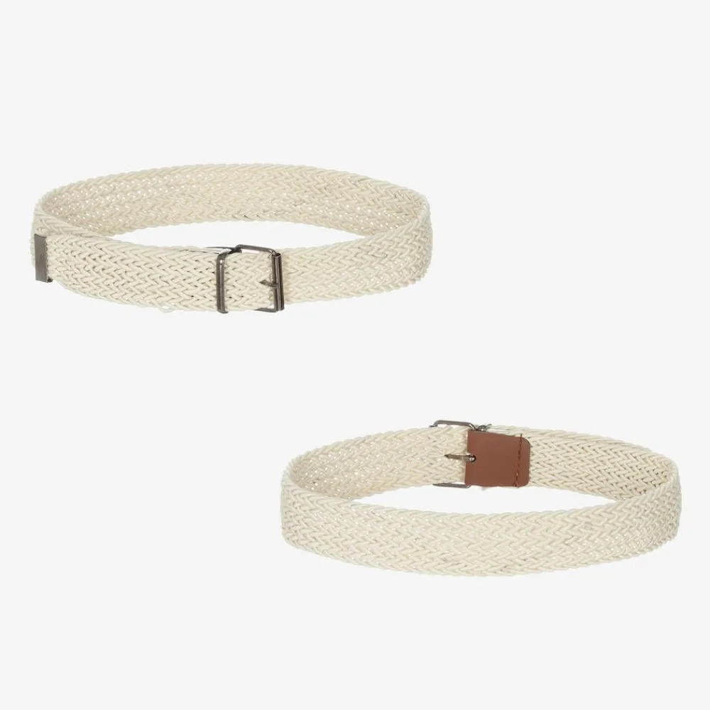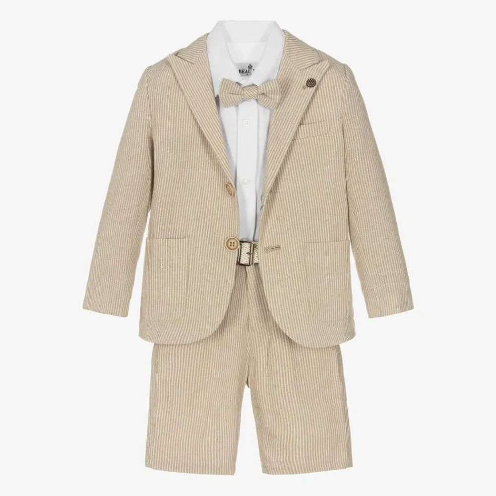 Smart beige and white shorts suit for boys by Beau KiD. Woven in mid-weight cotton, the jacket has a navy blue checkerboard lapel pin and a silky beige lining. The coordinating shorts have a useful adjustable waistband and come with a detachable beige woven belt. They have jetted front pockets and faux back pockets. The white shirt is made in lightweight cotton with a linen-effect weave. An adjustable, striped bow tie completes the set.