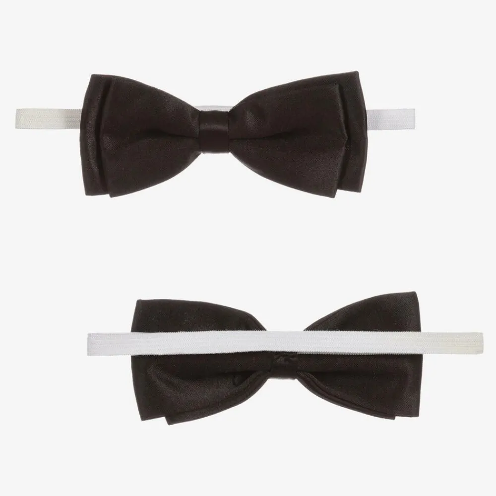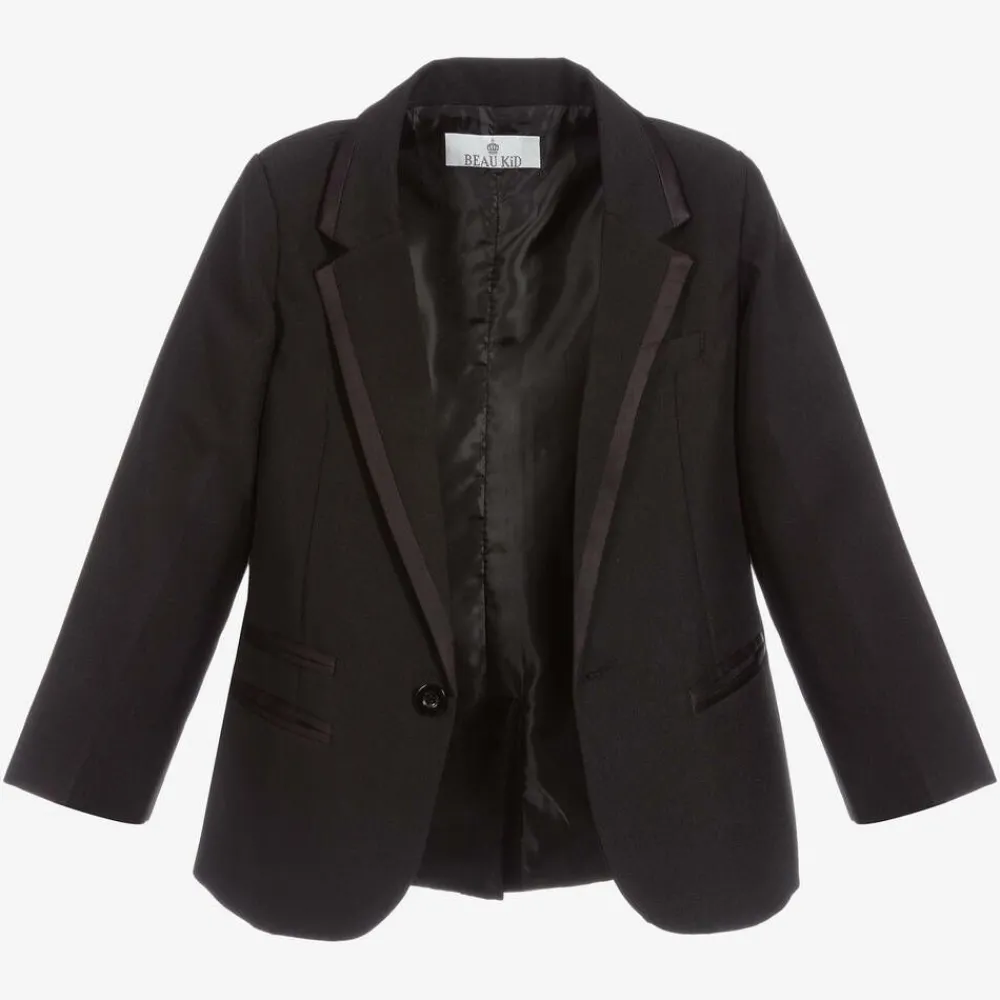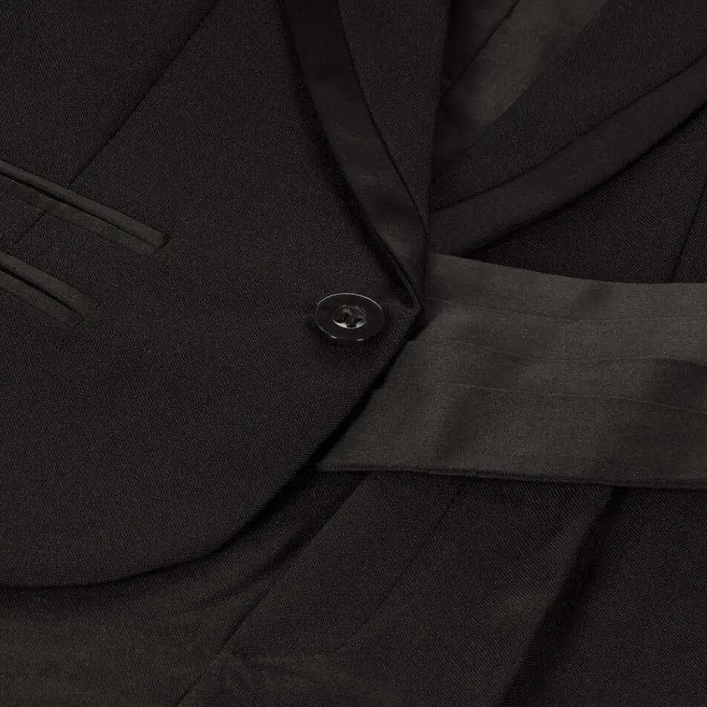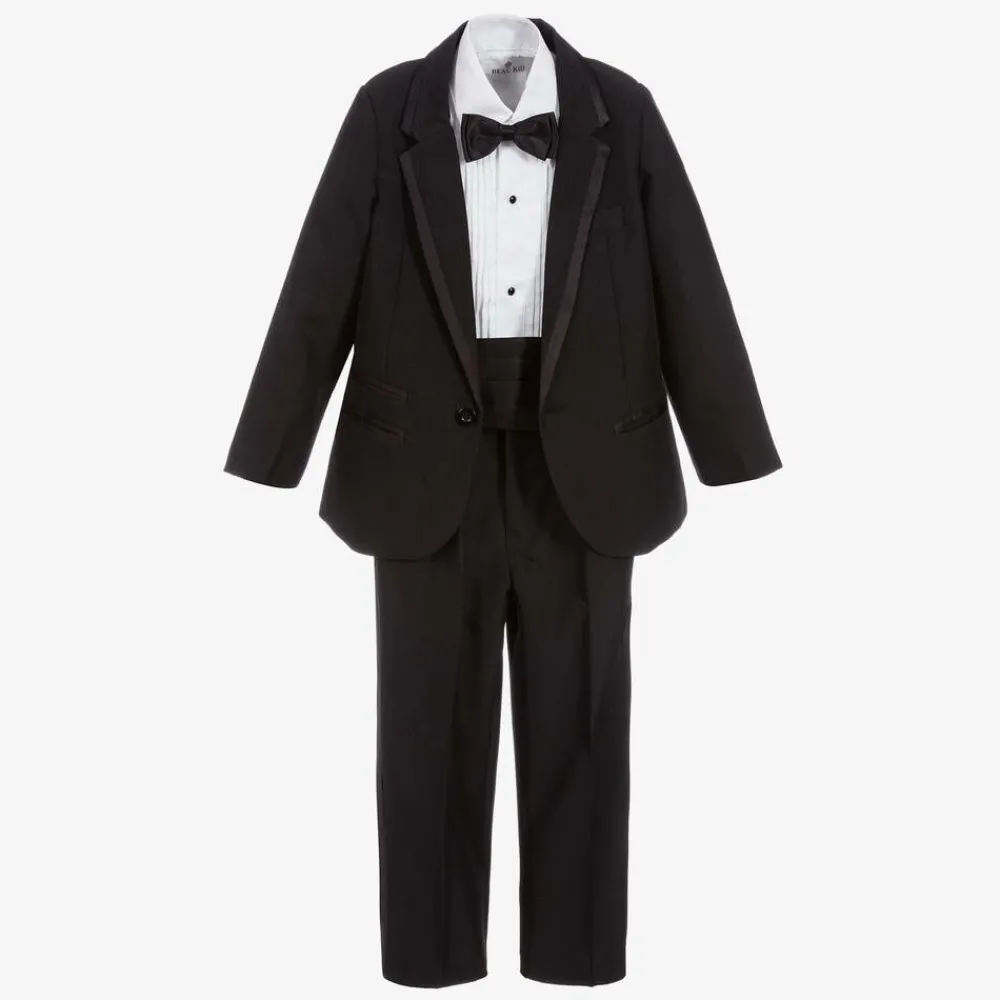Boys black, special occasion, five-piece tuxedo by Beau KiD. The jacket and trousers have a satin trim, matching the cummerbund and bow tie. The white polycotton shirt has pin tucks on the front and two sets of button fastenings. The black buttons can be removed and the white buttons used.