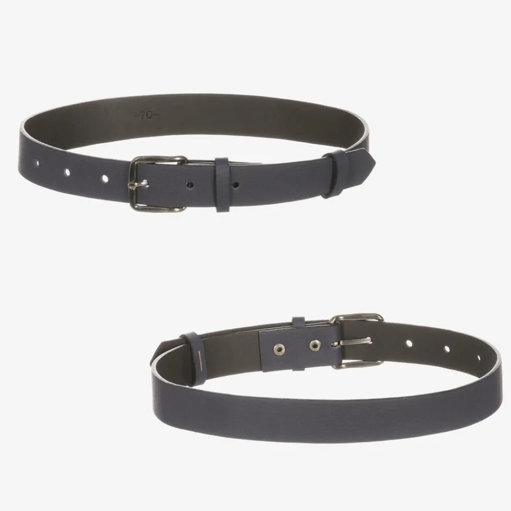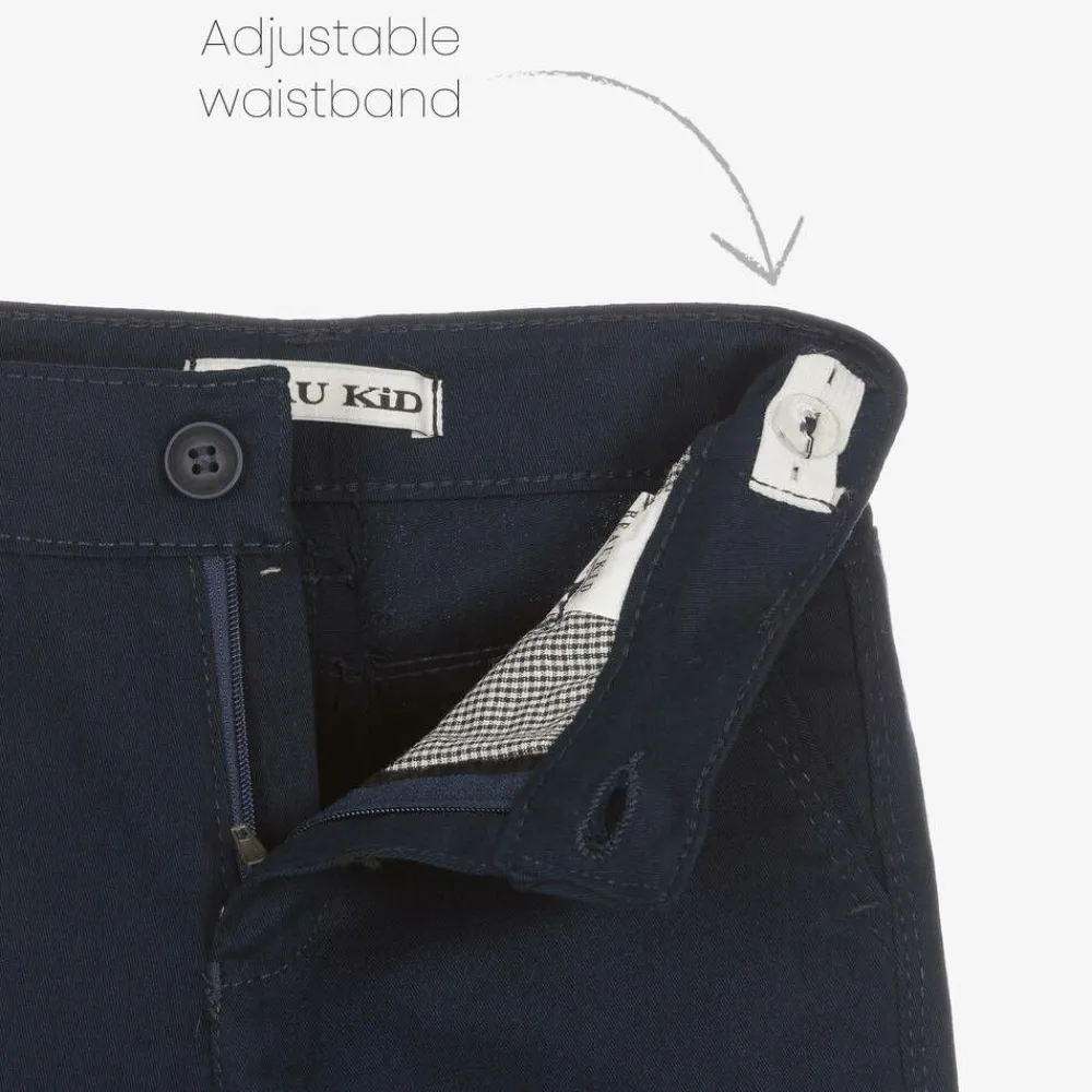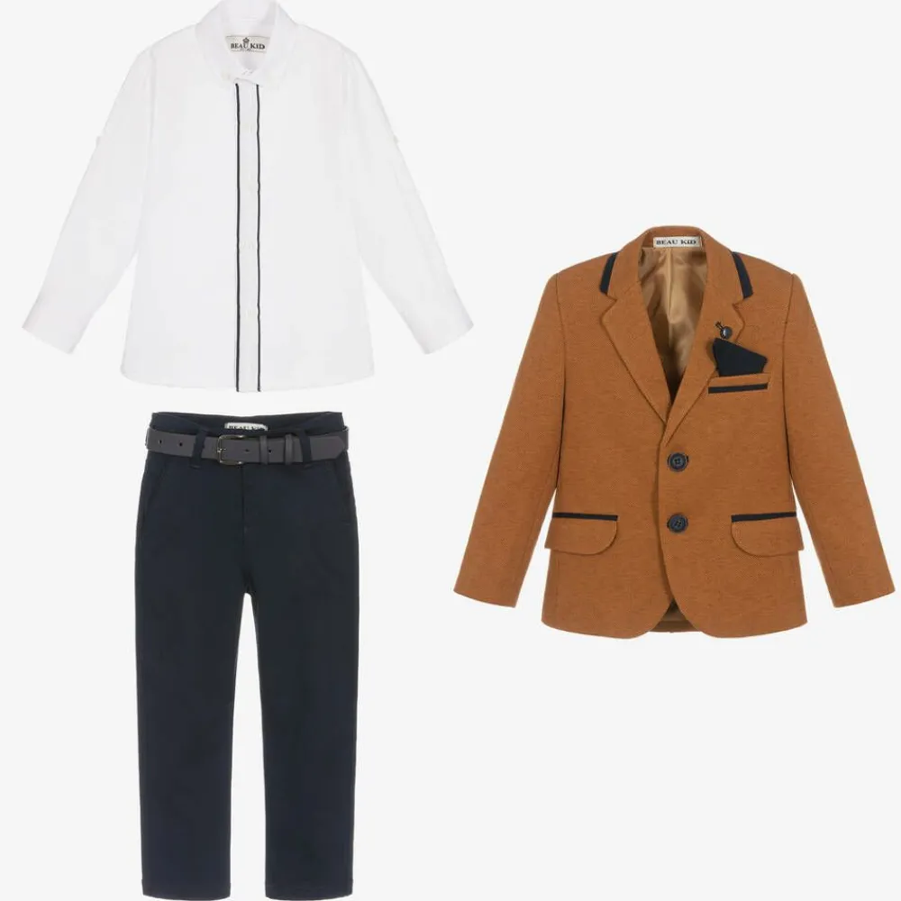 Smart tan brown and navy blue five piece suit for boys by Beau KiD, comprising a suit, bow tie, belt, and shirt. The marl brown blazer has navy blue trims and elbow patches, with a matching, removable pocket square and front button fastenings. The white cotton shirt also has navy blue trims and roll-up sleeves secured with buttons. The navy blue chino trousers have an adjustable waist for a good fit and useful front pockets. The suit comes with a coordinating, adjustable bow tie and a navy blue belt.