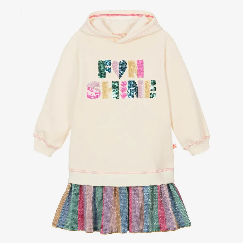 Great for a fun yet casual style, this ivory hooded long-sleeved dress for girls is by Billieblush. Made from soft mid-weight jersey with a cosy fleece interior, the hoodie-style top has 'Fun Shine' printed in colourful and glittery lettering on the chest with sequin embellishments for added sparkle. The neon pink topstitching adds an element of contrast and there is a branded tab on one side seam. Lined in lightweight viscose jersey, the attached sunray pleated skirt is striped in an array of muted tones and stitched with transparent sequins for a shimmery finish.