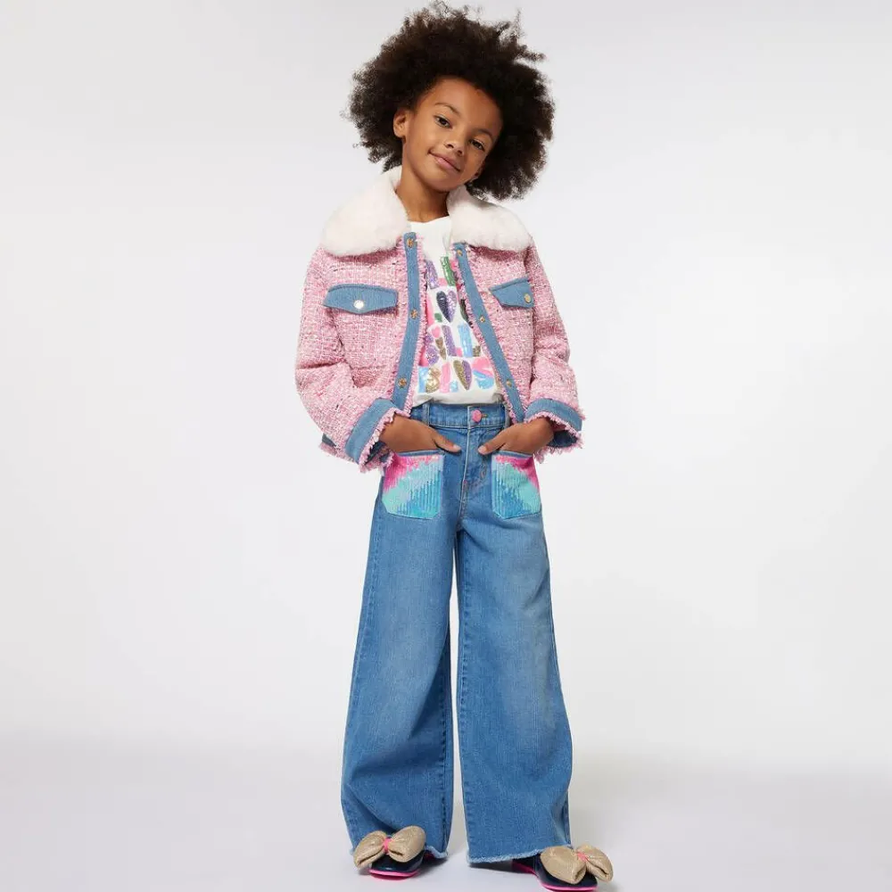 Glittery navy blue ballerina pumps for girls by Billieblush, made in shiny faux patent leather. Fun and cute, these pumps have a large gold bow on the front and are finished with the lining and soles in the brand's signature neon pink.
