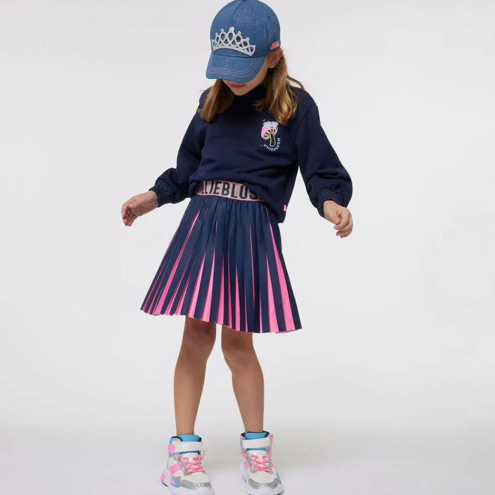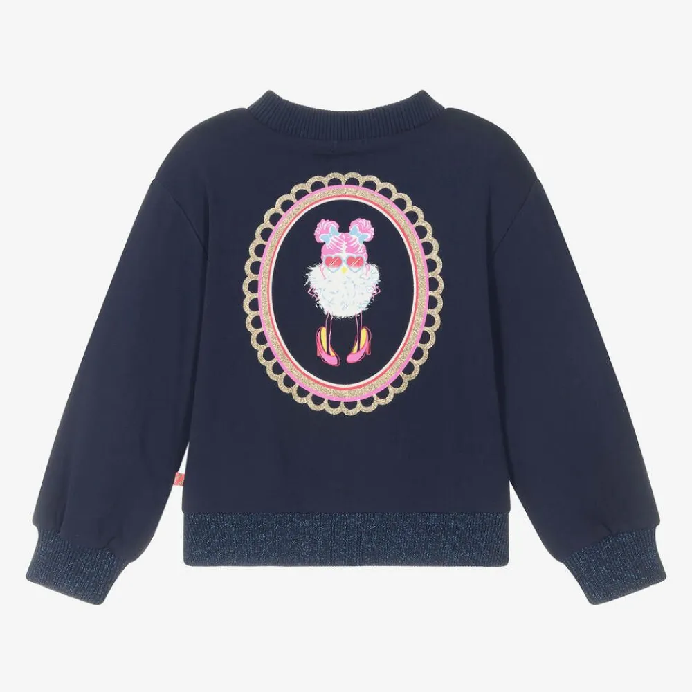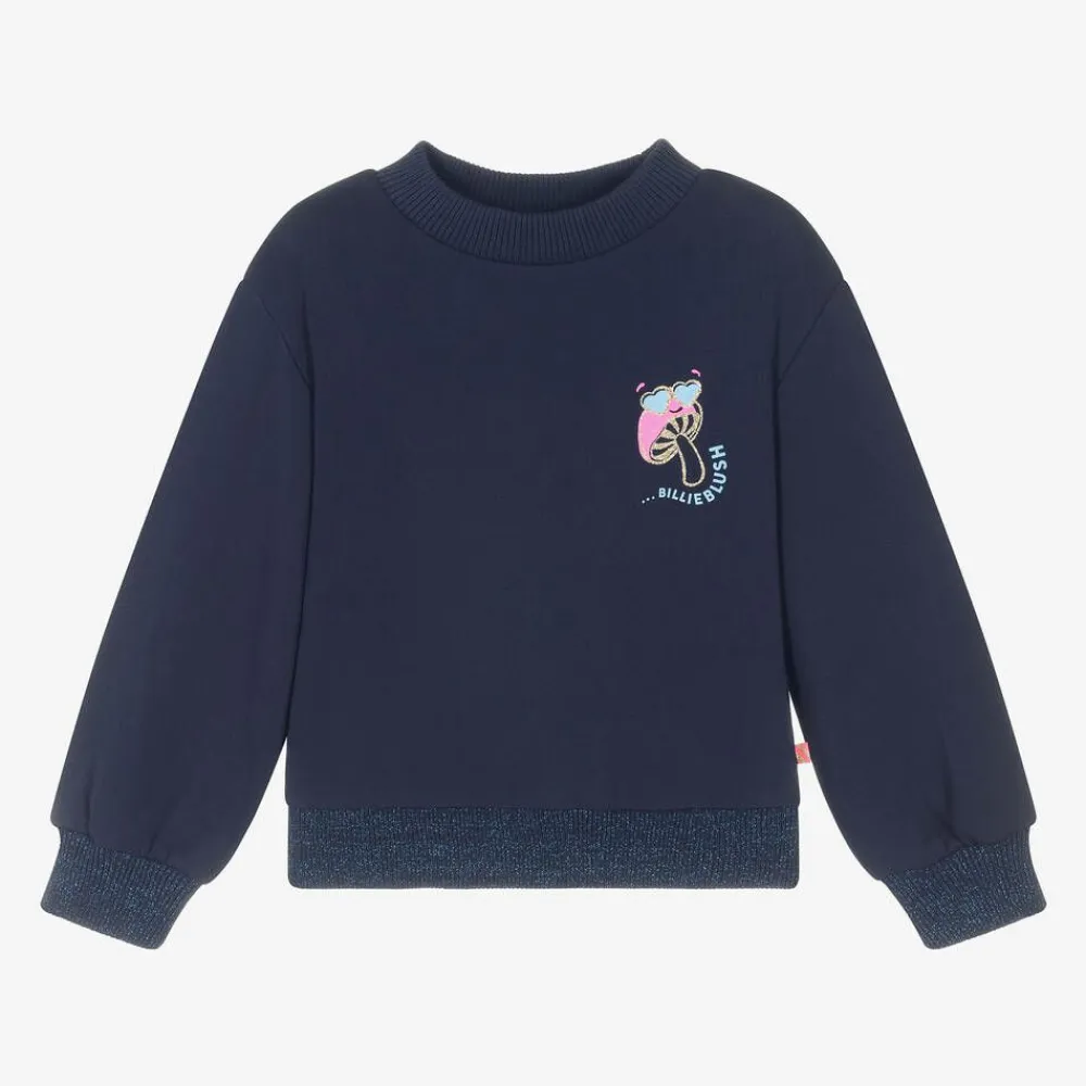 A navy blue sweatshirt for girls by Billieblush, made in mid-weight cotton jersey for comfortable dressing. This playful piece has a glittery mushroom motif on the chest with blue logo lettering below. A stylish chick can be seen on the back wearing pink high-heeled shoes and heart-shaped sunglasses. The cuffs and hemline are both stretchy and woven with glittery blue lurex thread for a touch of sparkle.