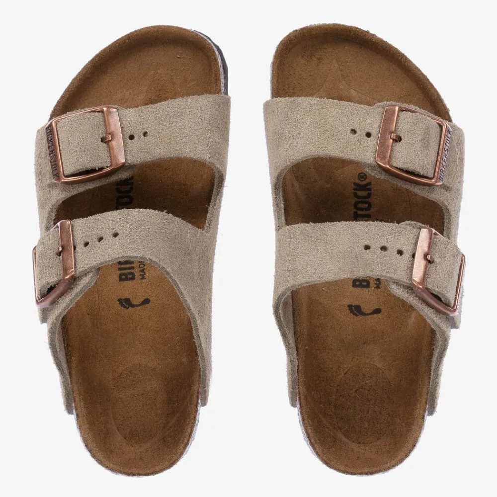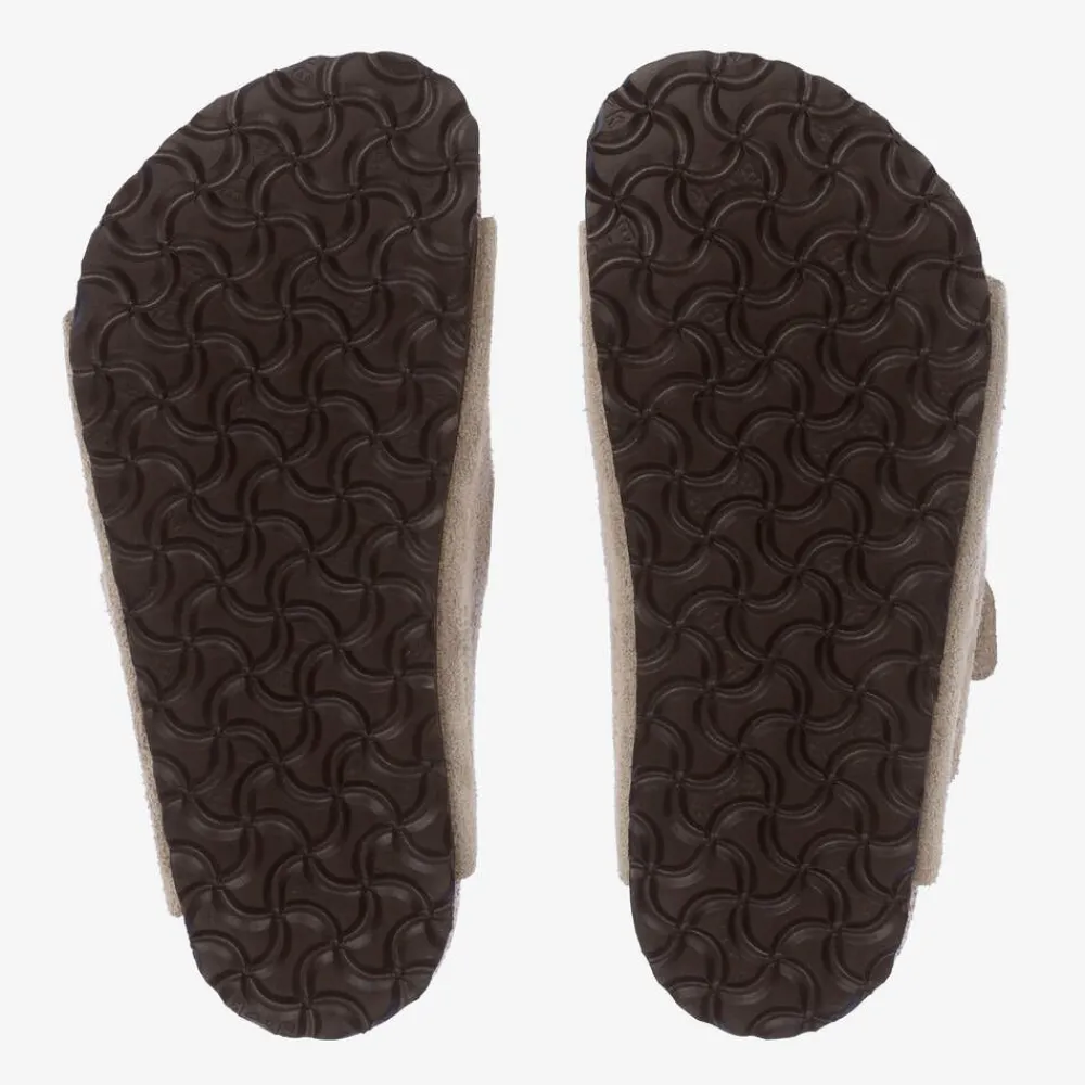 Timeless beige sandals for boys and girls by Birkenstock, made in the softest suede leather. These stylish sandals have copper branded buckle fastenings with adjustable straps. For comfort, the insole is made of soft suede with a cushioned natural cork footbed. They have contrasting dark brown slip-resistant EVA rubber outer soles.
