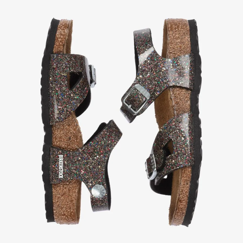 Pretty black sandals for girls by Birkenstock, made in the brand's signature Birko-Flor faux leather. Sparkled with flecks of colourful glitter, the uppers have two buckle fastening straps on the front and a supportive strap that sits around the heel. The suede leather insole is moulded for maximum comfort, and the rubber outer sole is ridged for improved grip. For an iconic Birkenstock look, the footbed is made in natural cork.
