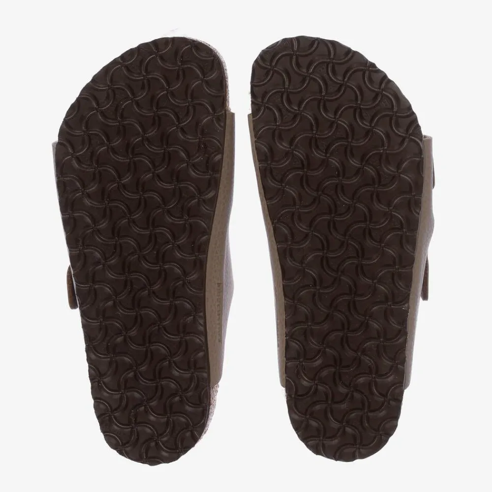 Taupe brown sandals for boys and girls by Birkenstock. In the brand's stylish Arizona silhouette, these narrow-fit shoes have adjustable buckle-fastening straps across the foot for a secure fit. They are lined in soft textile for comfort and have a fluffy, natural shearling wool insole that is both cosy and breathable. The contoured natural cork midsole promotes good walking posture with a non-slip, ridged rubber outer sole providing good grip. For that classic Birkenstock look, an embossed logo can be seen on one side.