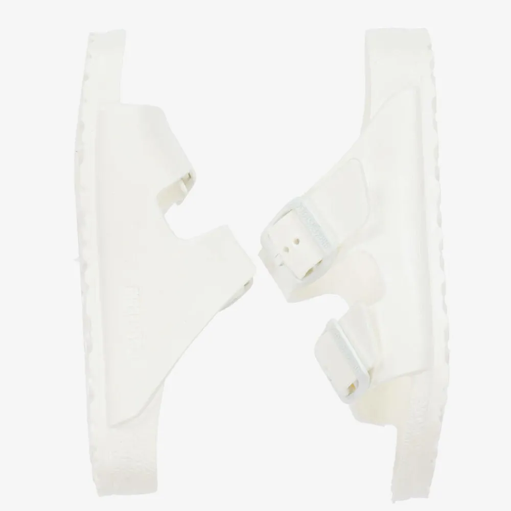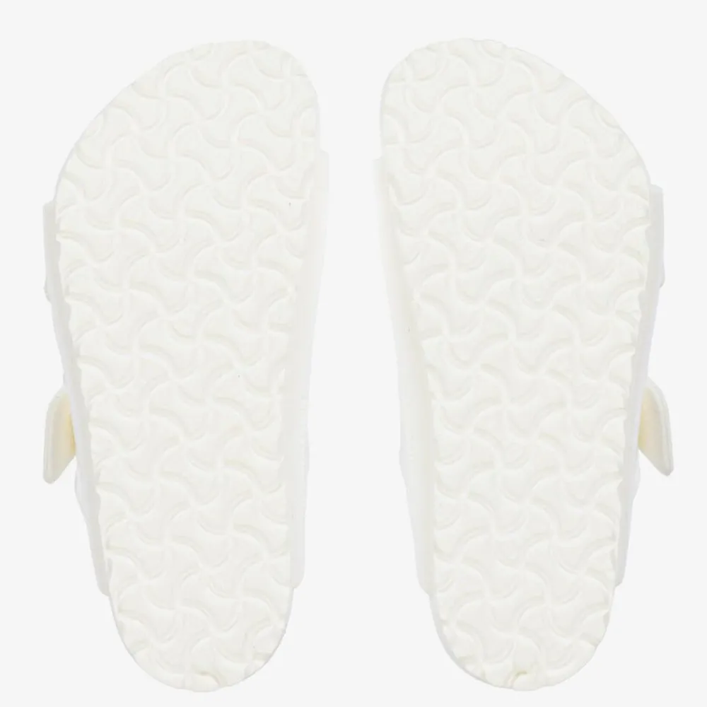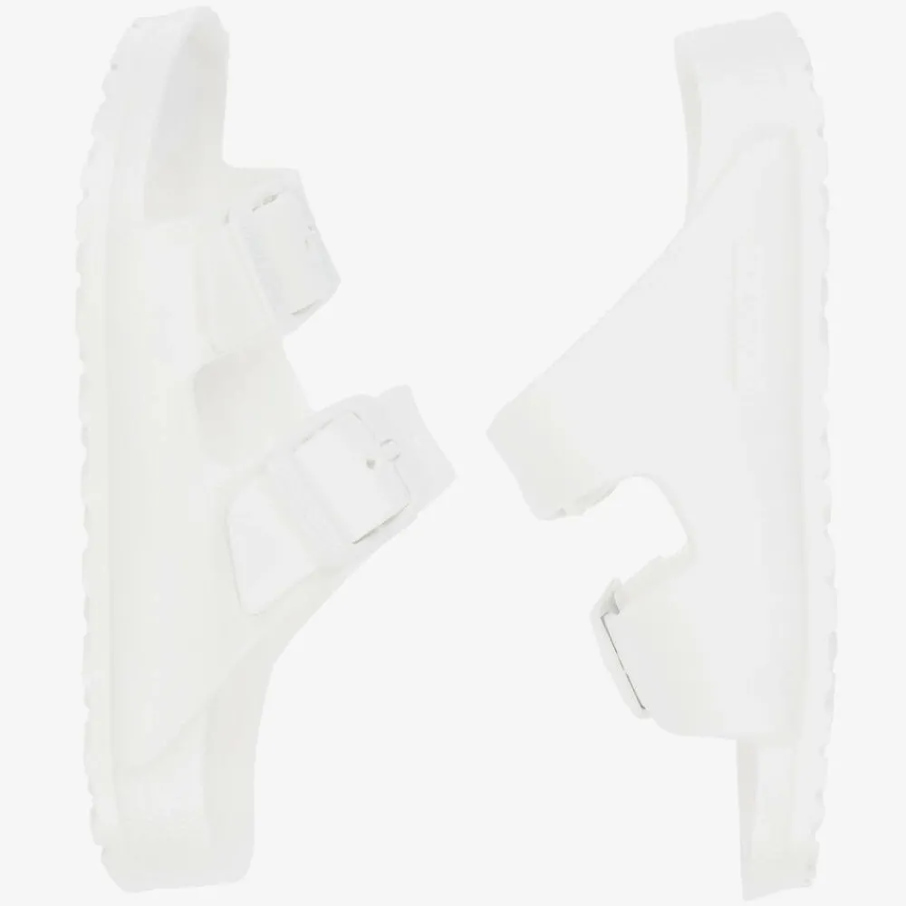 White sandals for boys and girls by Birkenstock, made in waterproof and ultra-lightweight EVA foam rubber. They are modelled after the iconic, anatomically shaped footbed which helps support the foot's natural shape. Easy to slip-on for everyday casual or poolside cool, they have two adjustable buckle-fastening straps over the foot.
