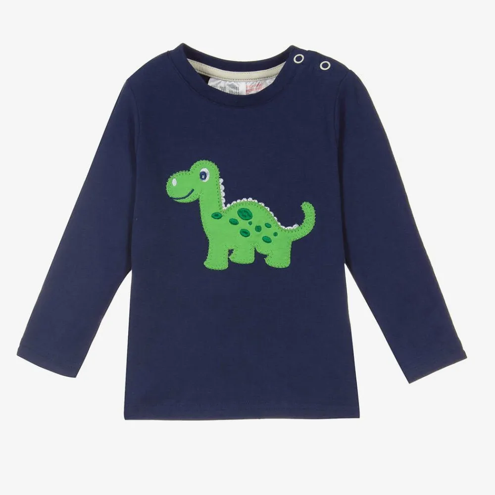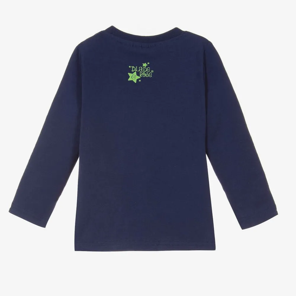 Cute blue long-sleeved top for little boys by Blade & Rose, with green Maple the Dino appliquéd on the front. Made in cotton jersey with a soft brushed feel, it is comfortable to wear. There are popper fastenings on one shoulder to help with dressing and a green logo printed on the back.