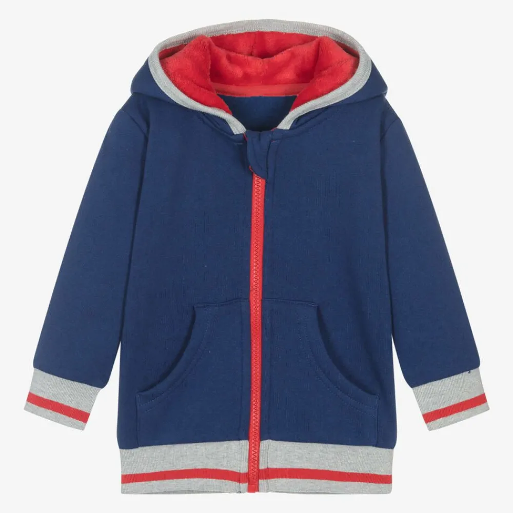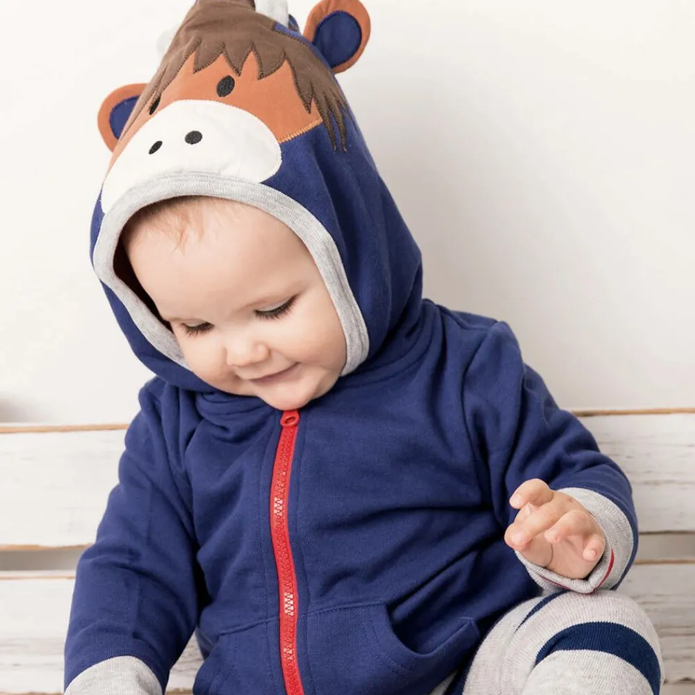 Blue cotton jersey hooded zip-up top for little boys and girls by Blade and Rose. This cosy top fastens with a zip on the front for fuss-free dressing. The complementary grey and red striped trims are ribbed for added comfort and the front pouch pockets are ideal for keeping little hands warm. The hood is lined in super soft fleece and finished with an adorable Hamish Highland cow face with 3D horns and ears.