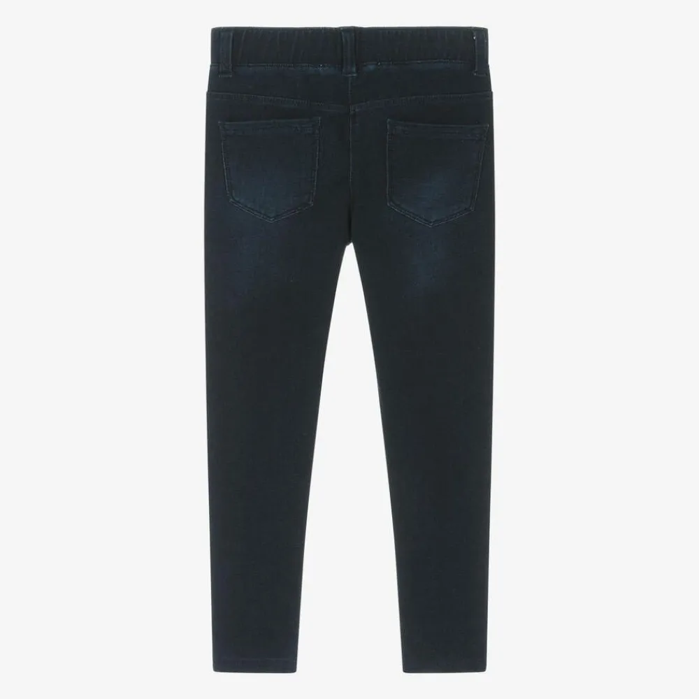 Casual dark indigo blue denim look jeggings for girls by Spanish brand Boboli. made in a soft and stretchy cotton blend jersey. They have belt loops, faux pockets with silver rivets and an embossed logo tab on the front. There are two patch pockets on the back and an elasticated waistband for easy pull-on.