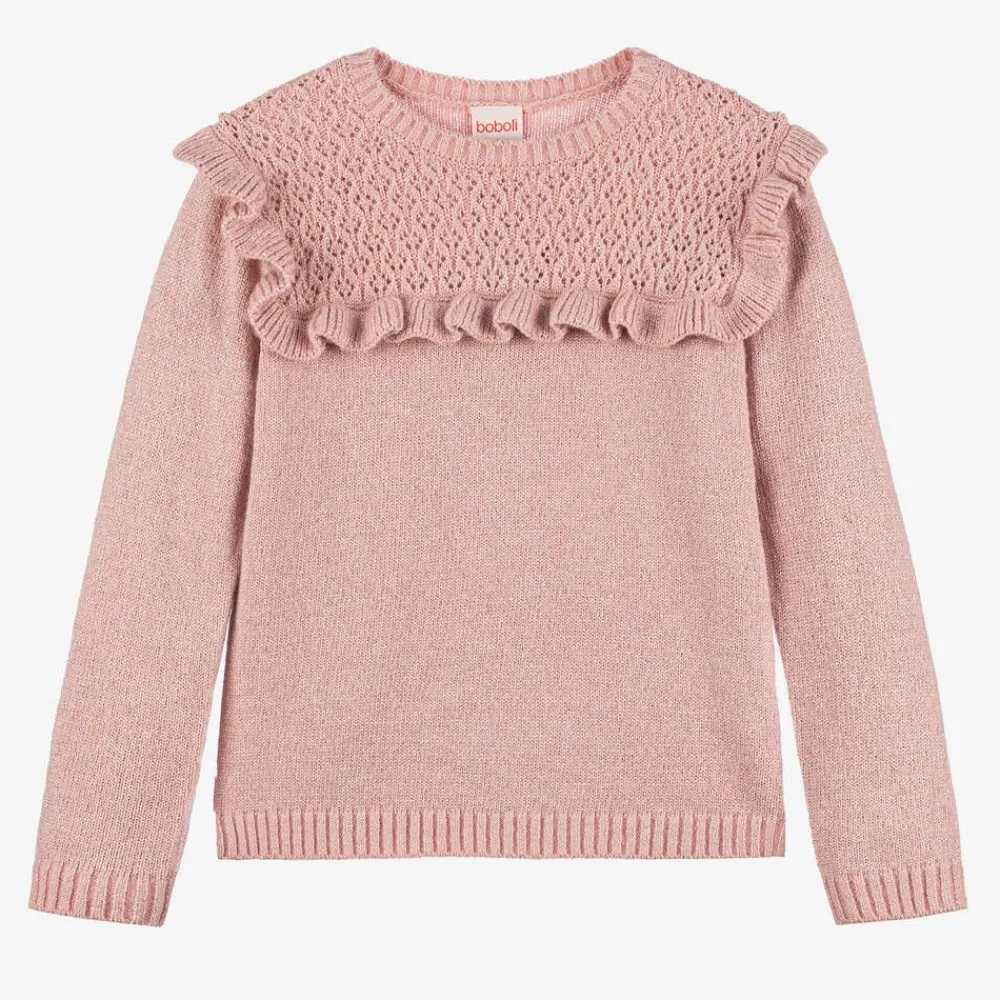 Pink knitted sweater for girls by Spanish brand Boboli, sparkling with silver thread. Made in a soft, lightweight cotton blend, the bodice has a pretty lace pattern and a ruffle detail. The sweater has neat, ribbed trims for extra cosiness.