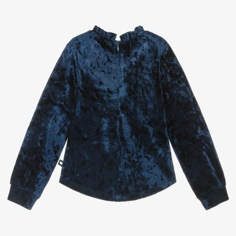 Beautifully soft, navy blue velour top for girls by Spanish brand Boboli, with a sumptuous sheen. Ideal for special occasions or for just making the every day a little less ordinary, it has a ruffled, stand-up collar, and a concealed zip fastening on the back. A black and glittery silver logo tab is sewn on one side seam.