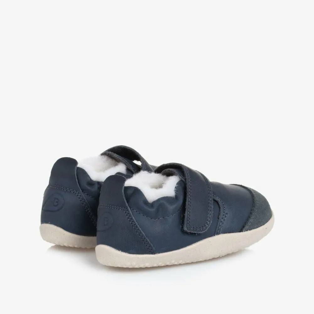 Navy blue leather first walker shoes for baby boys and girls from Bobux Step Up, designed for growing feet. Made with a water-repellent coating and a scuff-resistant toe cap, they have a cosy faux fur lining and an easy velcro strap fastening. The non-slip rubber outer sole is super flexible to support natural movement as they take their first steps.