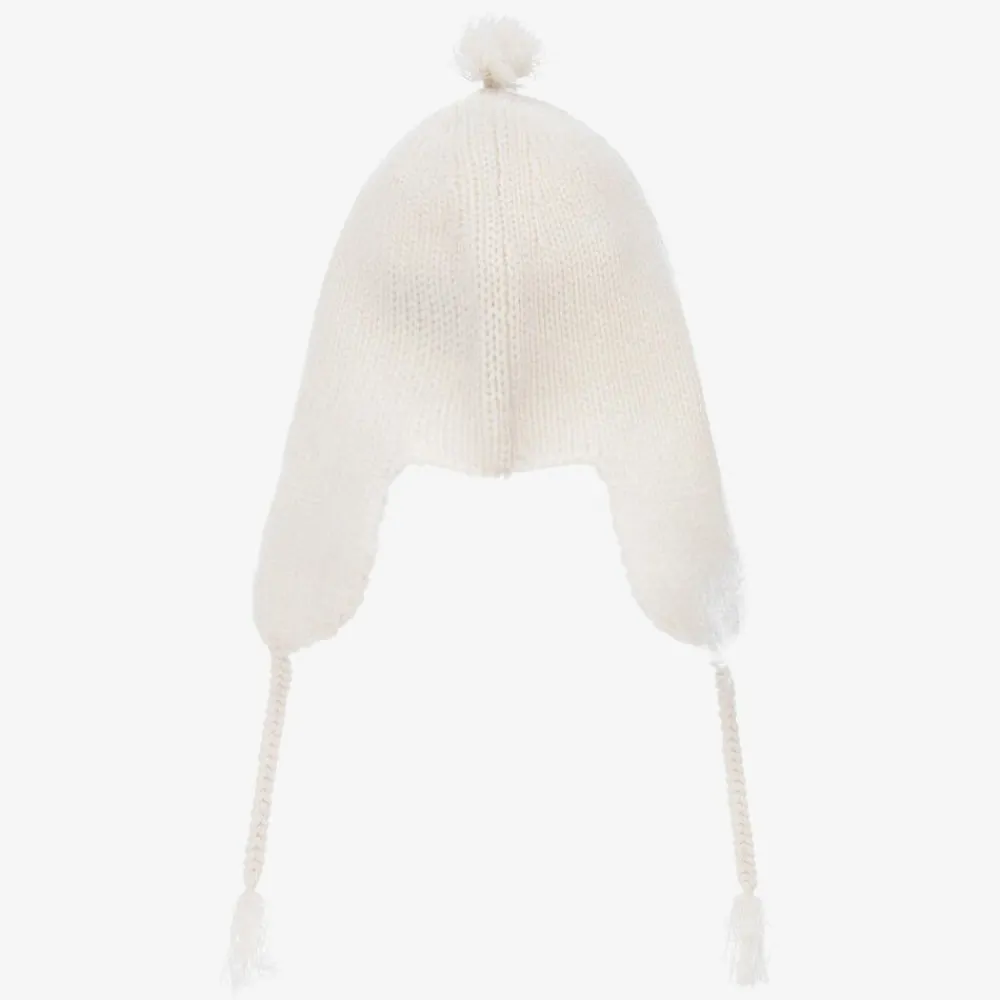 Beautifully soft ivory hat for little boys and girls by Bonpoint, knitted in luxurious cashmere. It has cosy ear flaps and is secured with braided ties under the chin. Sweet tassels on the ties and on the top of the hat complete the look.