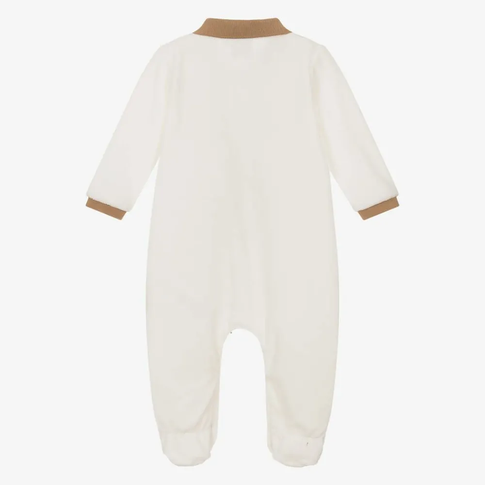 Presented in a branded box, this ivory babygrow for boys by BOSS, is made in wonderfully soft organic cotton velour. A lovely gift for a new arrival, this cosy one-piece has the brand's distinctive logo embroidered on the chest in black. The collar and cuffs are in contrasting beige and there are popper fastenings on the front concealed beneath a signature striped trim. Further poppers between the legs help with quick and easy dressing.