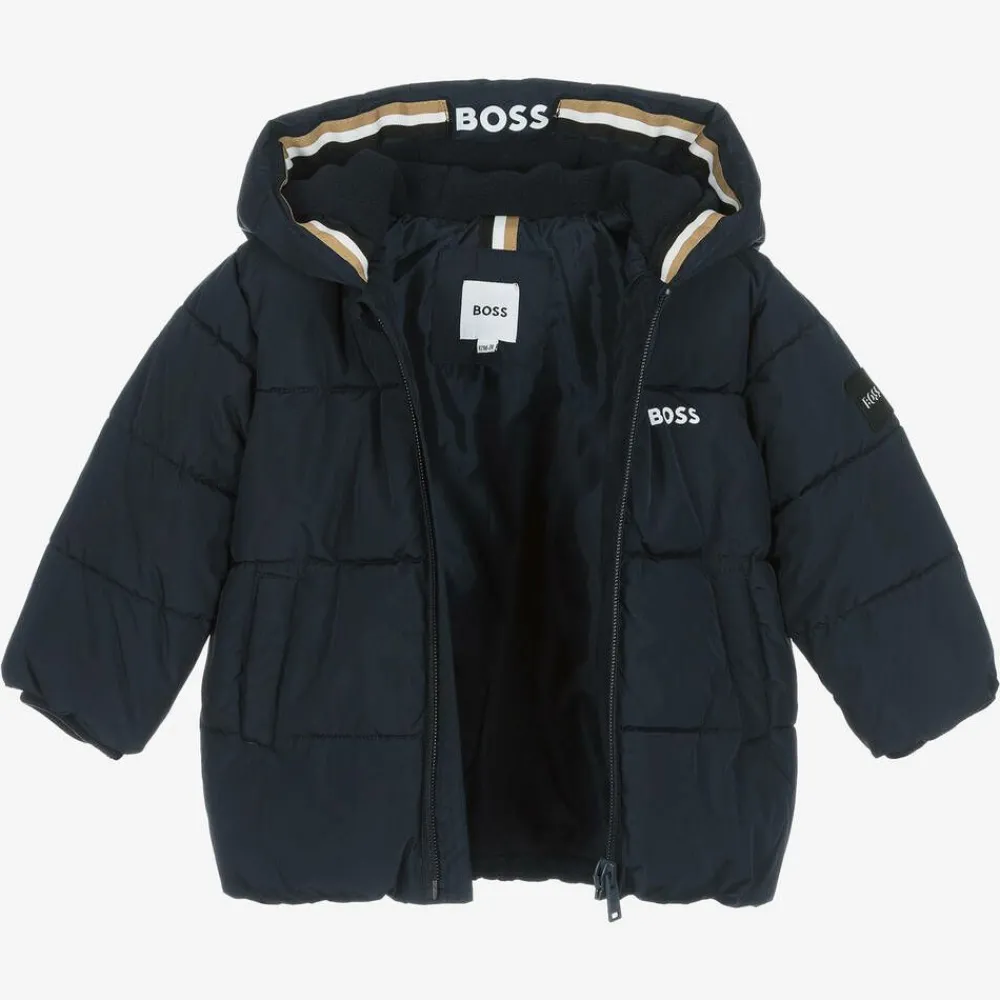 Cool navy blue zip-up puffer jacket for baby boys by BOSS. Logo branded throughout, it has a rubberised patch on one sleeve, white logo prints and the brand's iconic beige, white and black striped trims. Silky smooth and warmly padded, it is made from recycled fibre. The hood and pockets are fleece-lined for cosiness and there are elasticated hem and ribbed cuffs to keep the cold air out. The chin guard over the zip prevents rubbing. This item contains at least 60% recycled material.