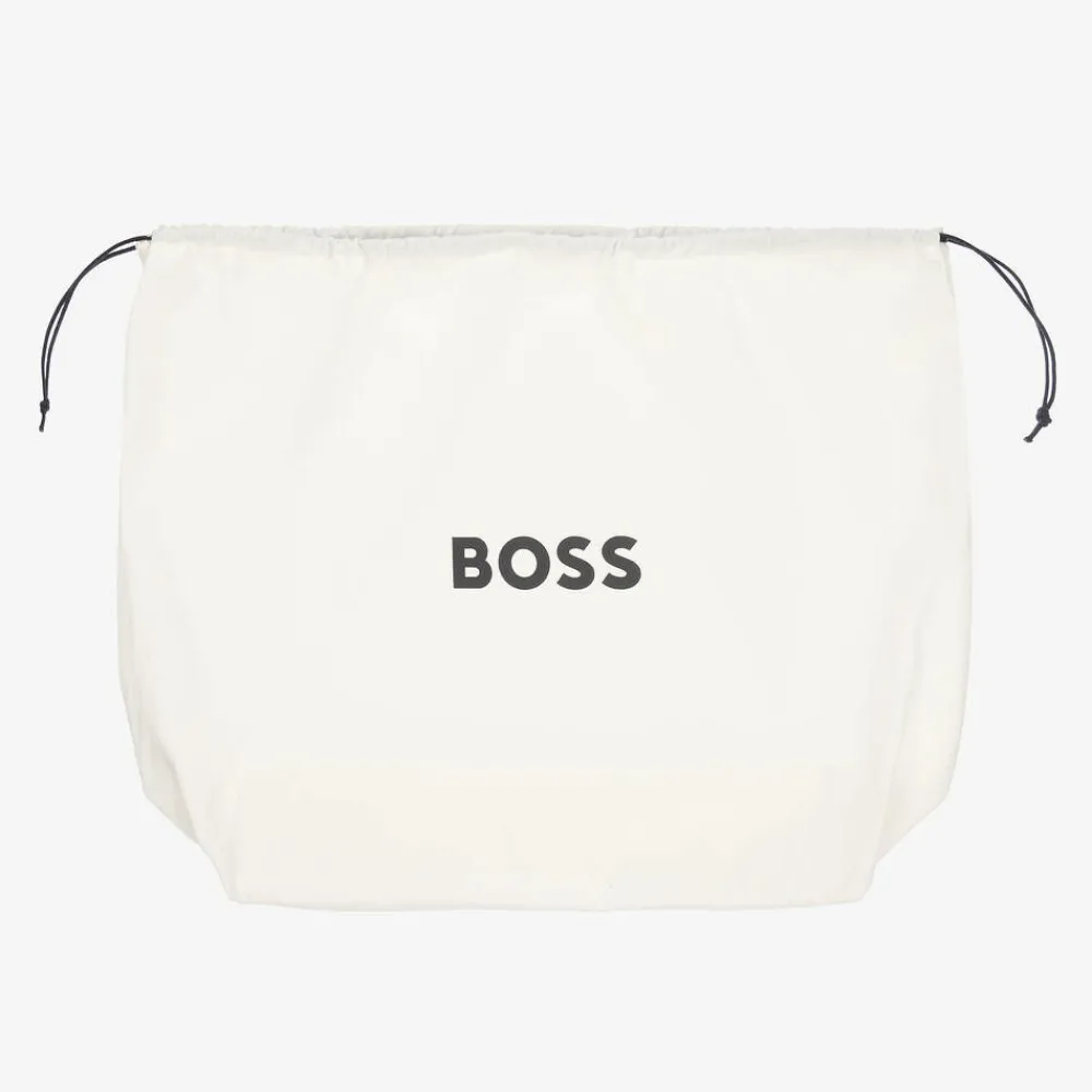 A stylish and functional beige changing bag by BOSS, with signature stripe detailing and a white logo print on the front. With a faux leather feel, this spacious bag is designed with a zipped main compartment, a small front pocket and a detachable shoulder strap. It comes with a handy changing mat and a pair of removable stroller straps. Inside are multiple mesh pockets to help organise all your little one's essentials.