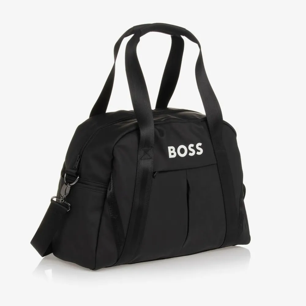 A black changing bag by BOSS, with a bold white rubberised logo on the front for designer appeal. Easy to wipe clean, the spacious zip-fastening main compartment has four internal mesh pockets to help organise essentials. There are easily accessible side pockets, ideal for bottles, a slip pocket on the back and a further small zipped compartment on the front. It has fixed carry handles on the top and comes with a detachable shoulder strap and two useful buggy straps. A matching lightly padded mat is included, great for changes on the go.
