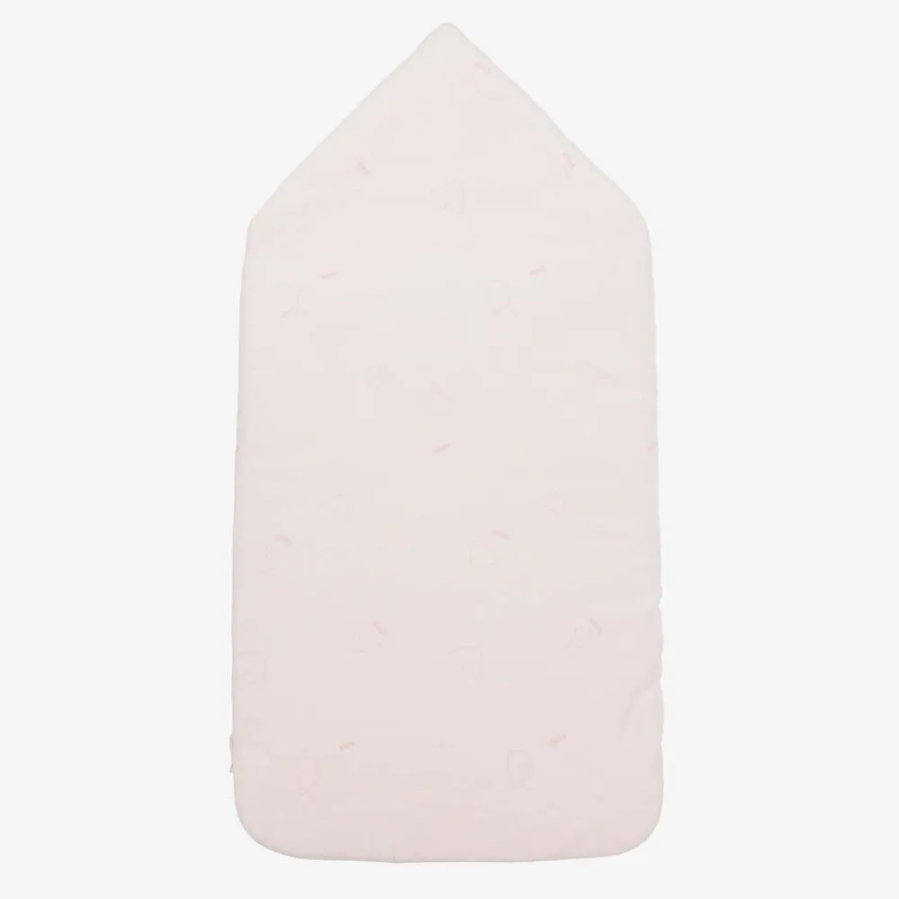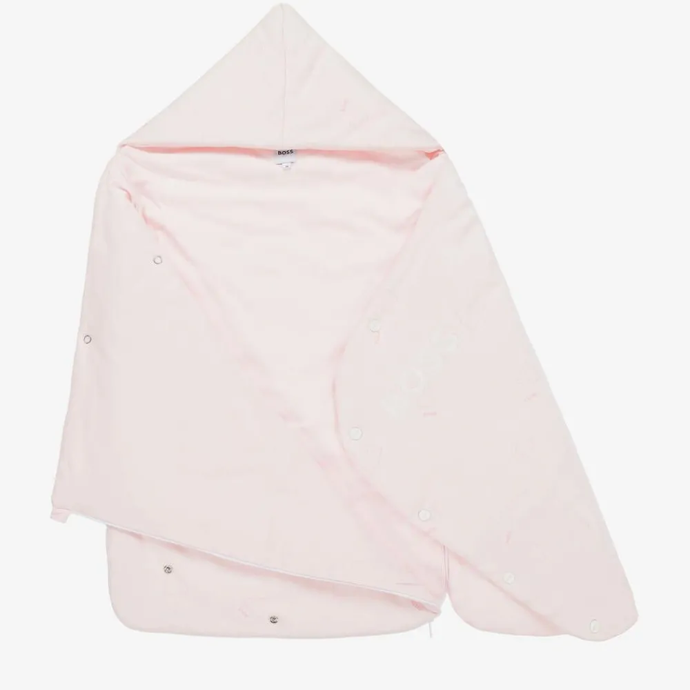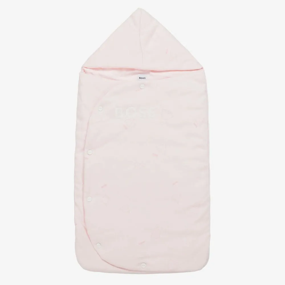 A pale pink nest for baby girls by BOSS, made and lined in super soft organic cotton jersey. It has a white and pink ginkgo leaf pattern that incorporates the designer's name, with a further logo embroidered in white on the front. Lightly padded for warmth, it fastens with a zip along one side and across the base and secures with branded poppers. When unfastened, this lovely nest can be laid flat providing a comfortable surface for baby to play on.