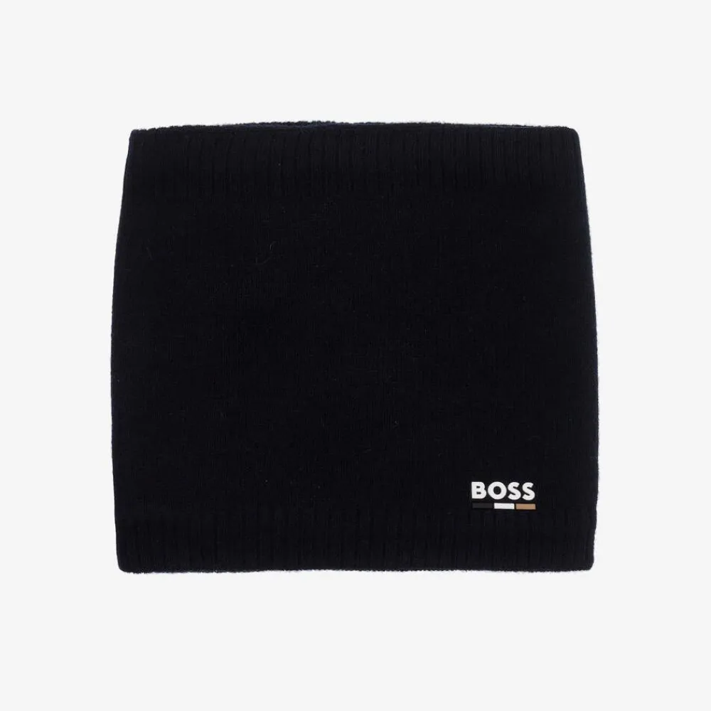 A navy blue snood for younger boys by BOSS, made in a super soft knit with a touch of wool for extra warmth. There is a white rubberised logo on the front for instant designer appeal and for that ultimate cosy feel, it is lined in super soft fleece.