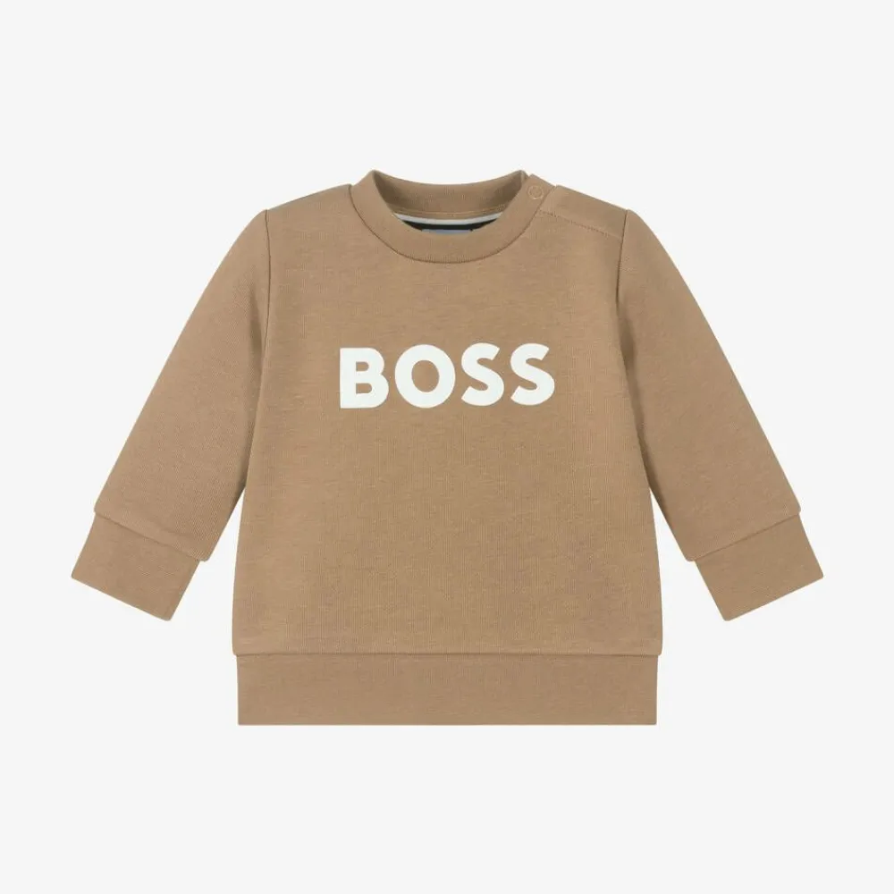 Beige cotton sweatshirt for little boys by BOSS, made in soft mid-weight jersey with a cosy fleece feel inside. This casual, long-sleeved top has gently ribbed trims and easy popper fastenings on one shoulder to help with dressing. There is a rubberised white logo printed on the front for a distinctive designer touch.