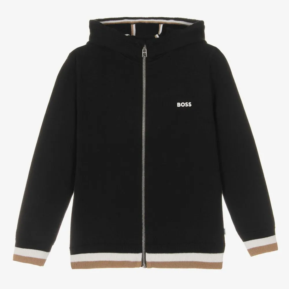 Black zip-up top for boys by BOSS, knitted in a soft cotton and wool blend. When an extra layer is needed, this long-sleeved top has a front zip fastening and a cosy hood with signature trims. There is a white logo print on the chest and beige, white and black stripes on the hem and around each cuff.