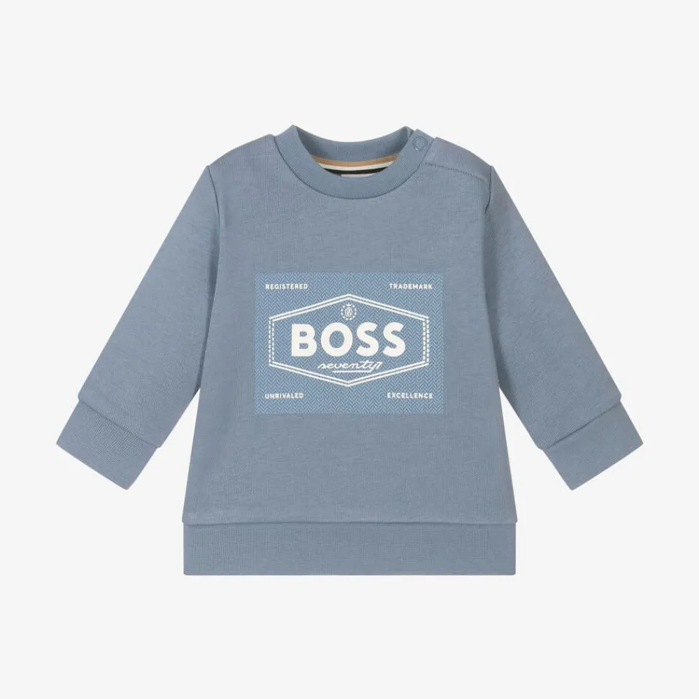Casual pale blue cotton sweatshirt for little boys by German brand BOSS, with the designer's unmistakable Original BOSS 1977 logo printed on the front in white. Made in soft jersey with a cosy, brushed inside, it has poppers on one shoulder for speedy dressing.