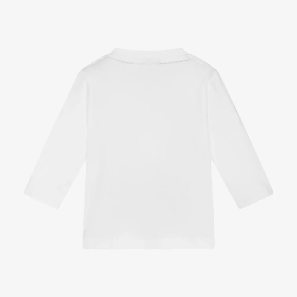White long-sleeved top for little boys by BOSS, made in soft cotton jersey. Comfortable and easy-wearing, this casual top has a black rubberised logo across the front, for an instant designer statement, and popper fastenings on one shoulder for easy dressing.