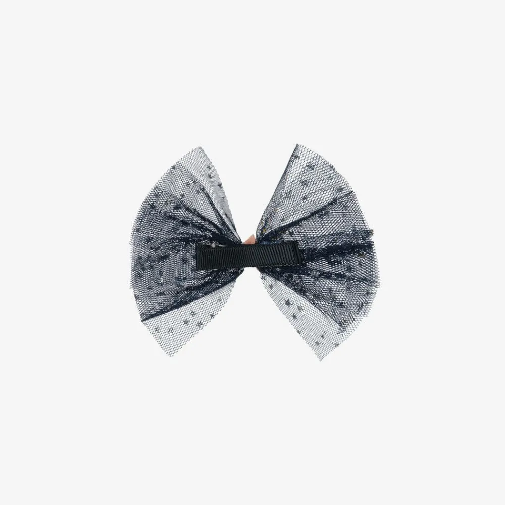 Great for parties, this navy blue hair clip is from Bowtique London. The handmade tulle bow is decorated in glittery gold stars with a charm in the centre. It is set on a fabric-covered clip for comfort.