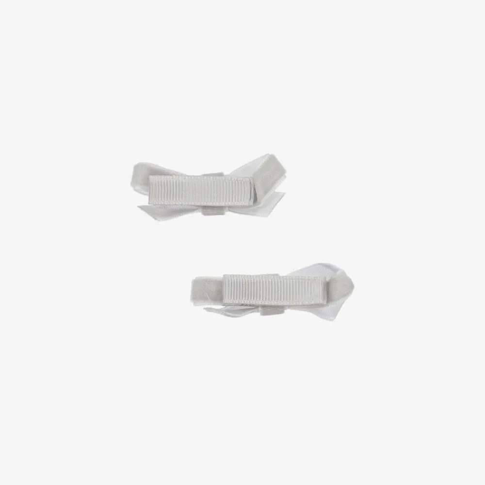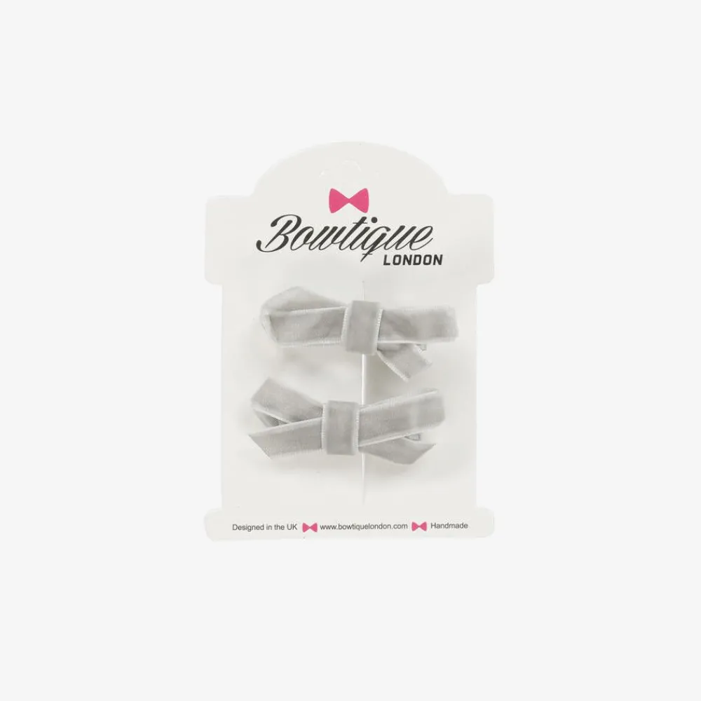 A pack of two grey velvet bow hair clips for girls by Bowtique London. A lovely finishing touch to complete an outfit, the bow is set on a metal clip for easy use.