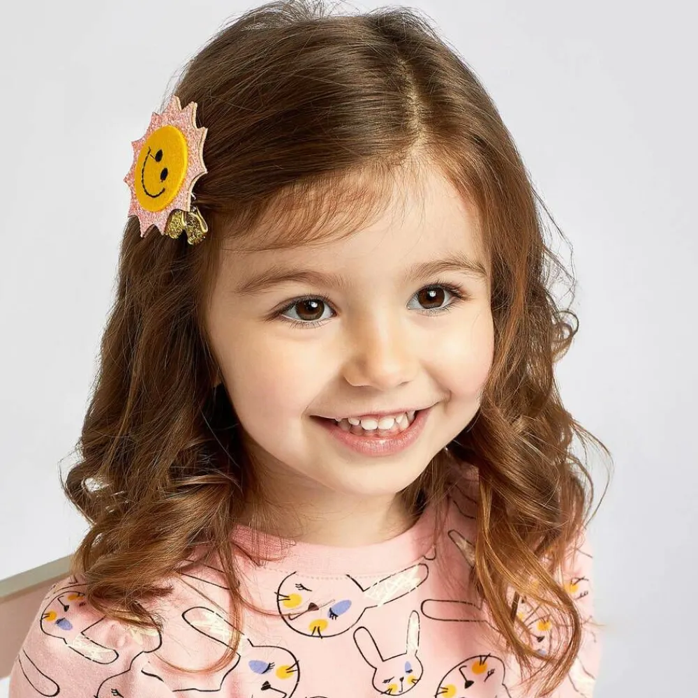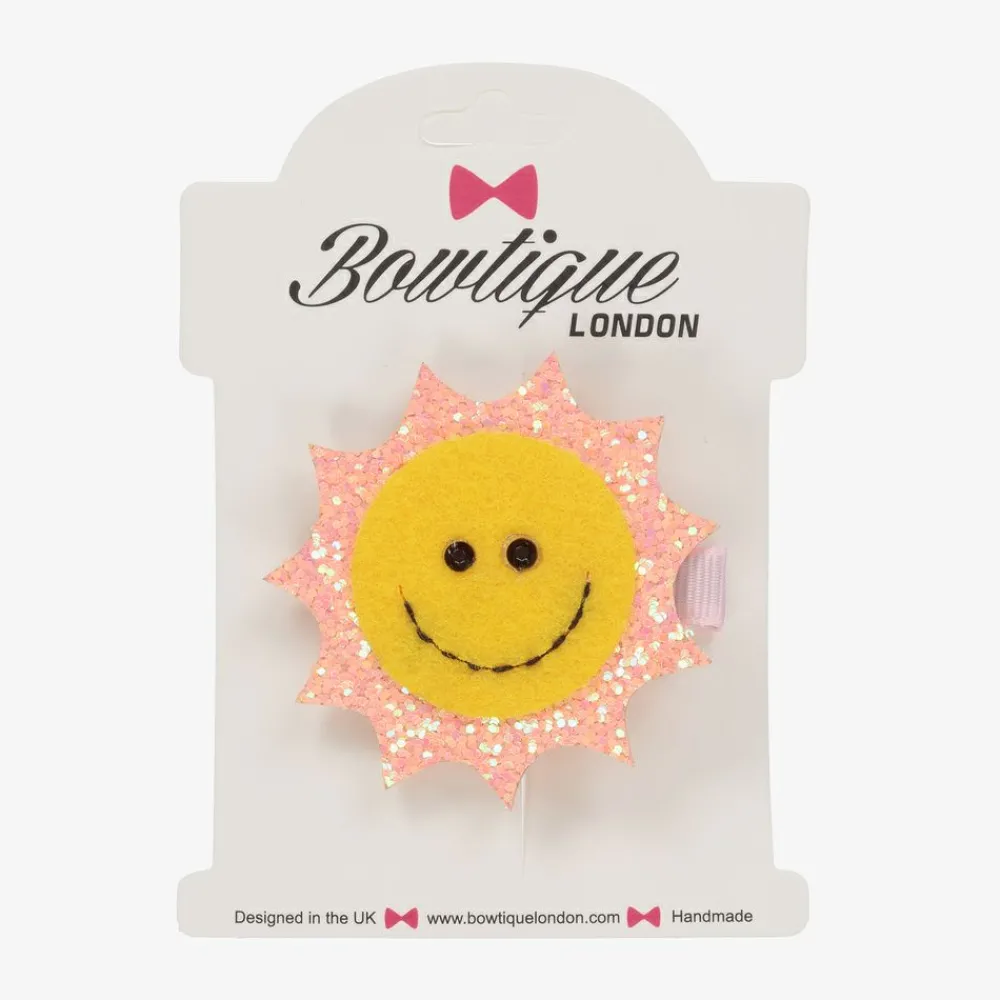 Adorable yellow and pink smiley sun hair clip by Bowtique London. Made in glitter covered soft felt, It has an easy slide-in alligator clip.