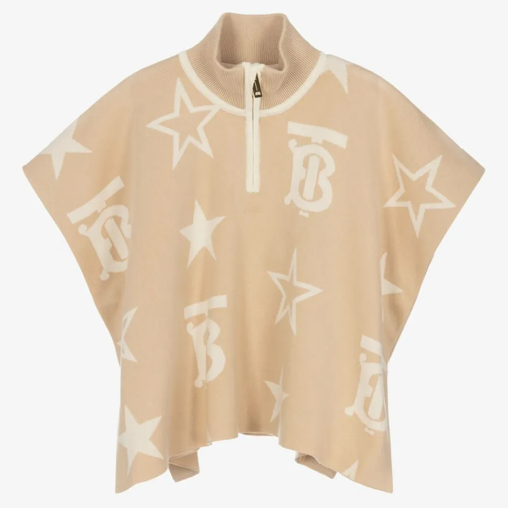 A classic beige cape for baby girls by British luxury brand Burberry, made in a soft cotton knit. Styled with a half-zip and funnel neck, this great layering piece features a Thomas Burberry Monogram and an all-over star intarsia design for added flair. Open at the sides, there are popper fastenings to create arm holes.