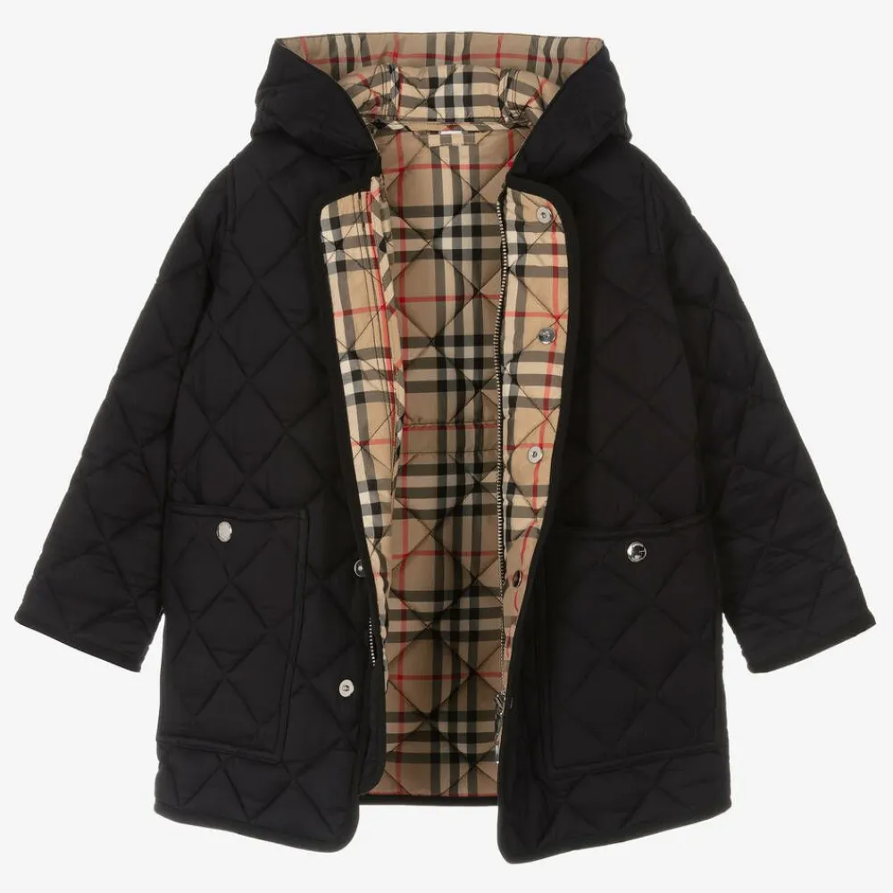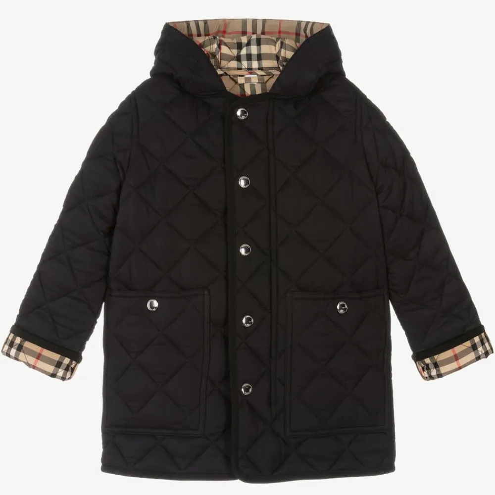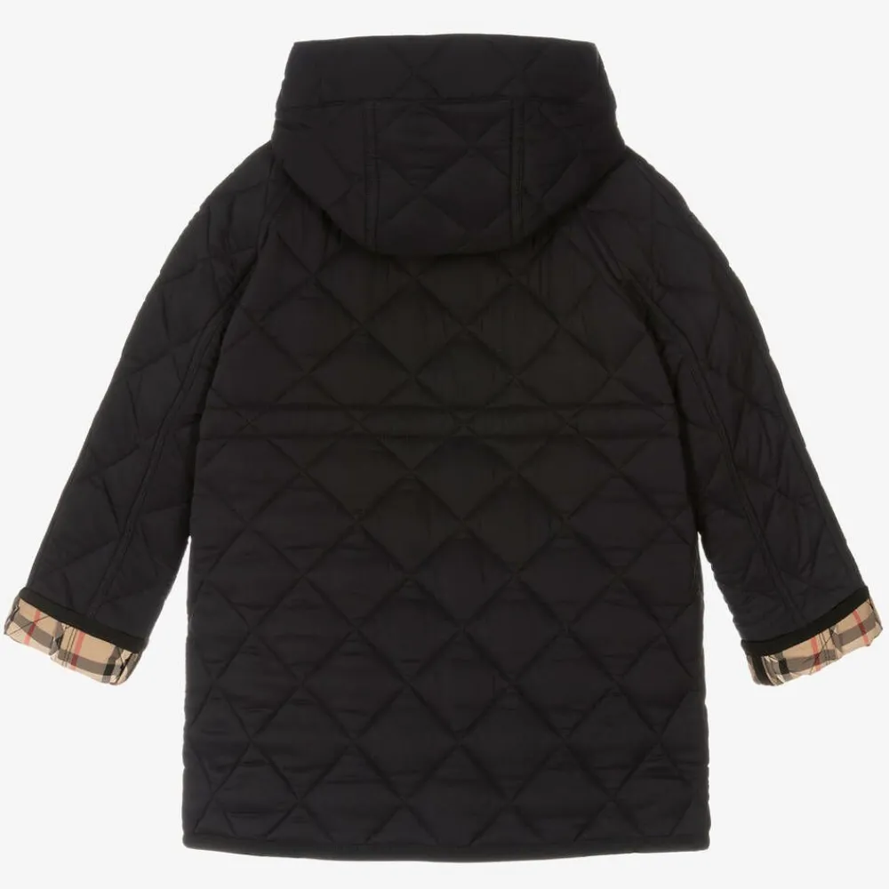 Black quilted hooded coat for boys and girls by British luxury brand Burberry, with a diamond pattern for a classic look. Made from water-resistant, ripstop nylon, it is lined in the designer's signature beige Vintage check, which can be revealed on turned-up cuffs and inside the hood. There is an adjustable internal elastic drawcord for extra definition at the waist and the coat fastens with a two-way zip beneath a branded popper flap. Oversized patch pockets with branded popper fastenings complete the stylish look.