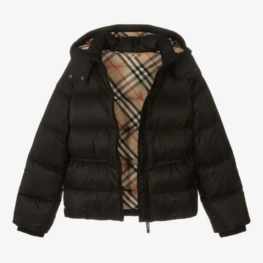 Cosy and stylish, black hooded puffer coat for girls by Burberry, lined in the luxury British brand's distinctive beige check. Silky smooth, it is warmly padded with down and has a useful, two-way zip fastening. The style is complete with popper-fastening side seam pockets.