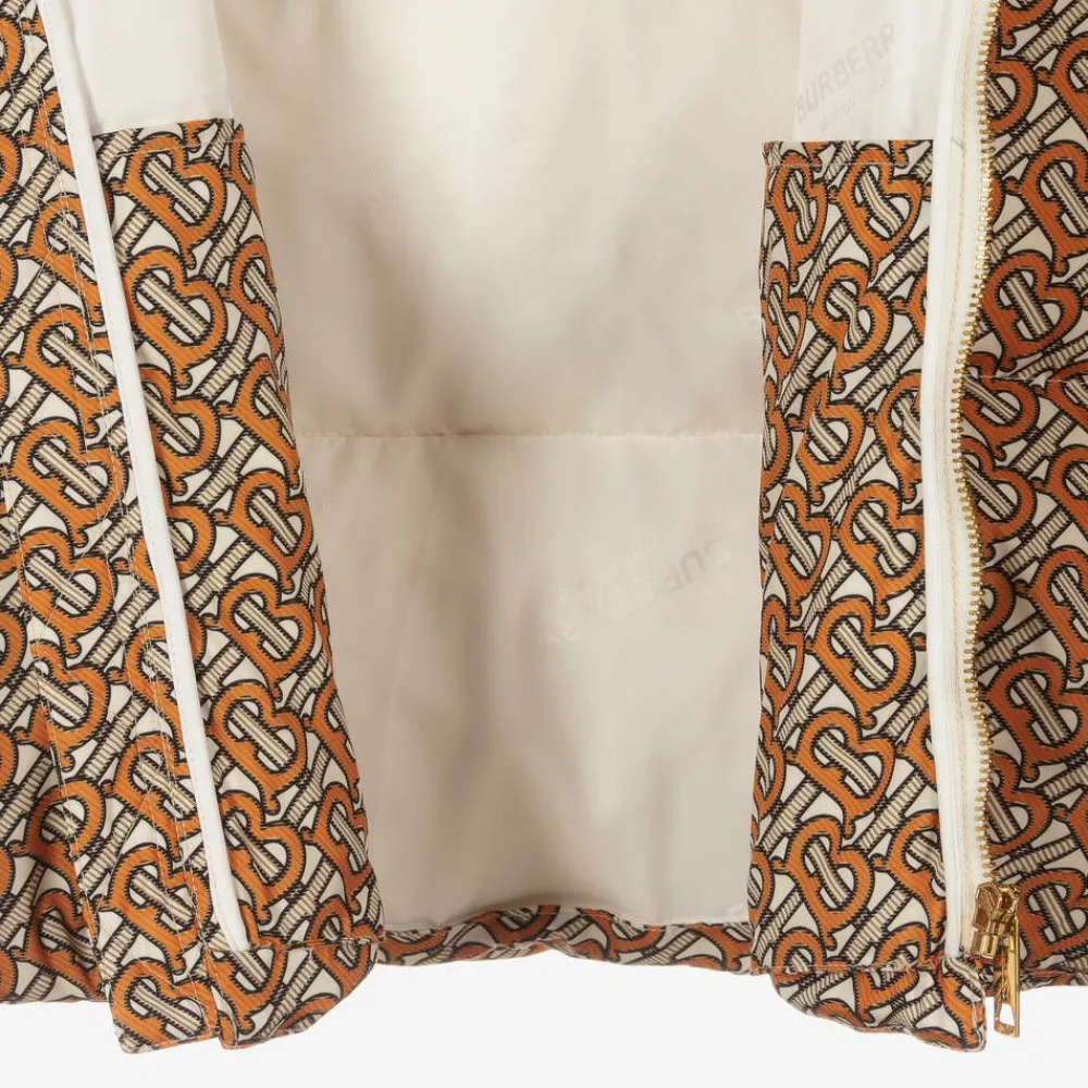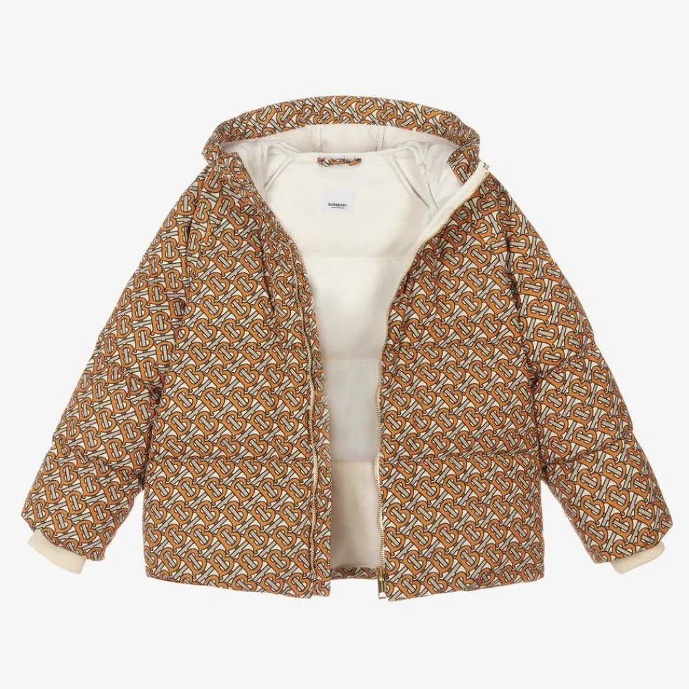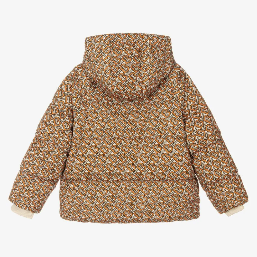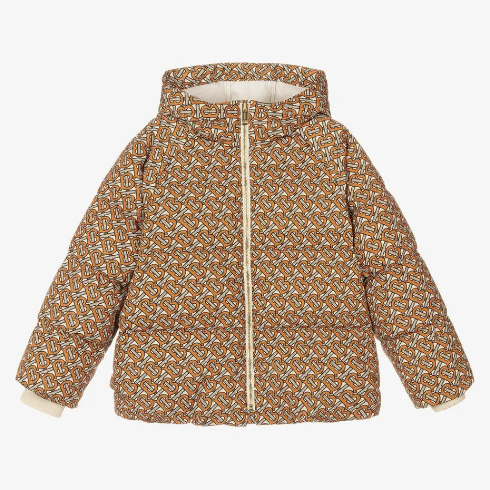 Teen boys will stay warm in this beige and orange hooded puffer jacket by Burberry, padded with luxurious down. Patterned with an all-over Monogram print, this striking outwear fastens on the front with a gold branded zip. It has a silky branded lining and useful side pockets with gold popper fastenings to help keep belongings safe. Inside is a silky, branded lining with large internal pockets, an elasticated drawstring and stretchy ribbed cuffs to provide protection from the elements.