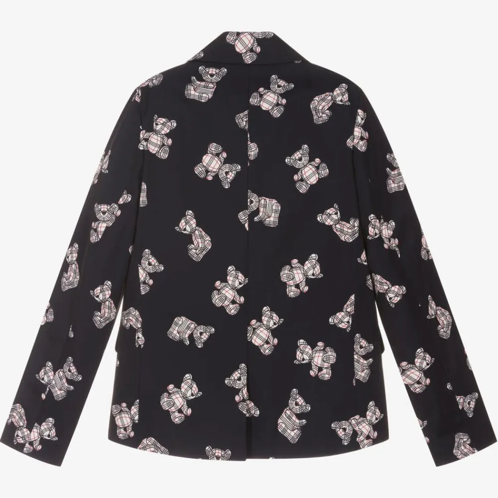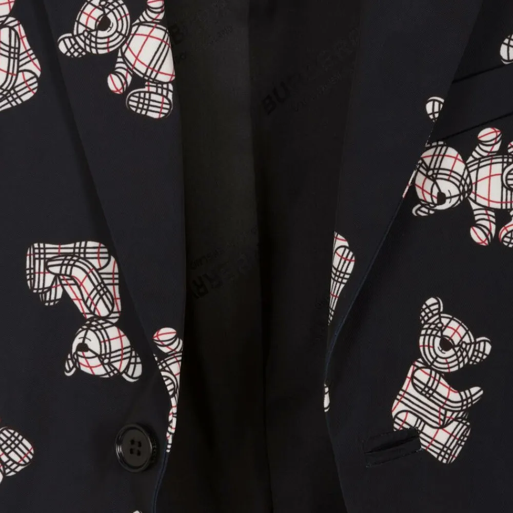 Midnight blue blazer for teen boys from British brand Burberry, patterned all over with the designer's Thomas Bear in red, white and blue for statement style. This smart tailored jacket is made from mid-weight polyester twill with a luxurious feel and is lined in satin with a logo jacquard weave. Single breasted with a vent on the back, it has a chest pocket, front flap pockets and useful interior pockets.