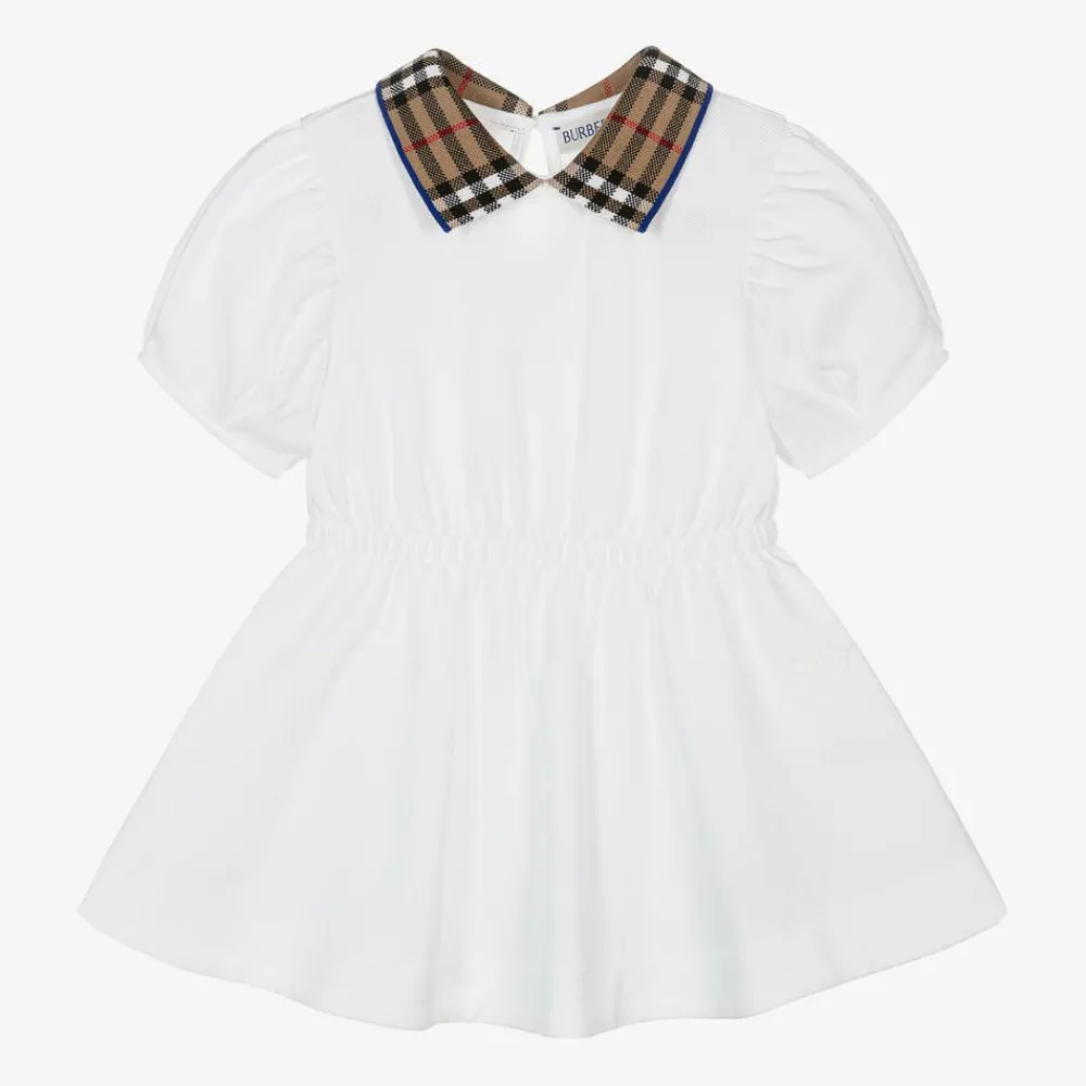 A white polo dress for baby girls by luxury British brand Burberry, made in soft and stretchy cotton piqué. The pointed collar is patterned in the iconic Burberry check with a signature Knight blue trim. It has puffed sleeves, a stretchy waist and a keyhole button fastening on the back. This item contains organic cotton.