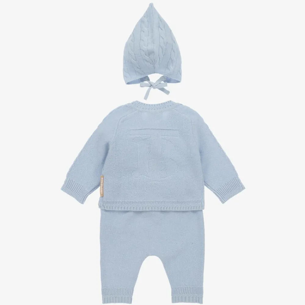 A delightful pale blue trouser set for baby boys and girls by luxury brand Burberry, made from a soft cashmere knit. Elegantly designed, the adorable buttoned cardigan has a subtle TB monogram on the back, cable knit detailing on the sleeves, and ribbed trims. The matching trousers have a comfortable elasticated waist with a faux drawstring and the cute pointed bonnet ties neatly under the chin. A beautiful present, this set comes in a lovely gift box.