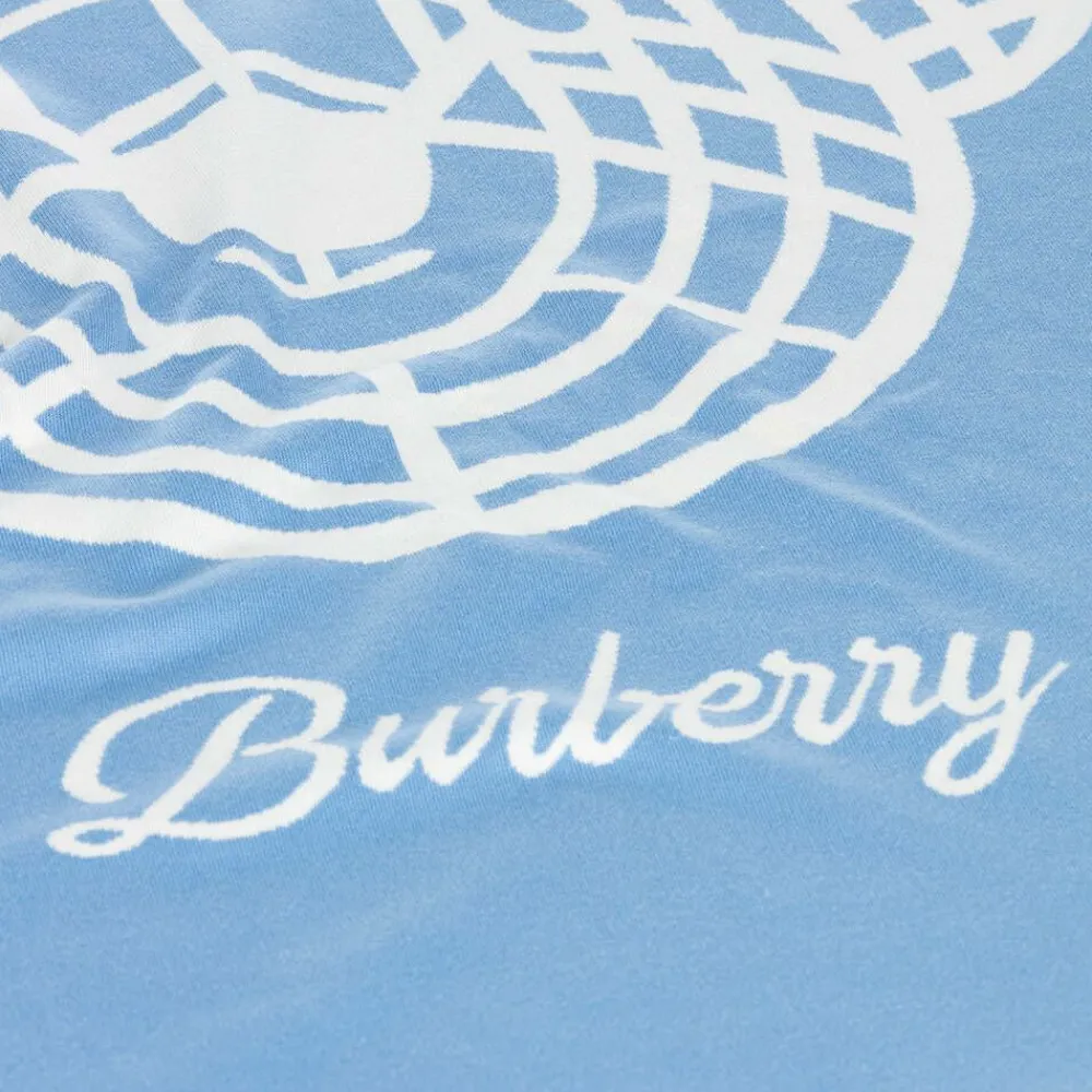 Gorgeously soft blue and ivory cotton knit blanket for baby boys from luxury British brand Burberry. The different side mirror one another, and feature the designer's adorable Thomas Bear mascot with logo lettering beneath.