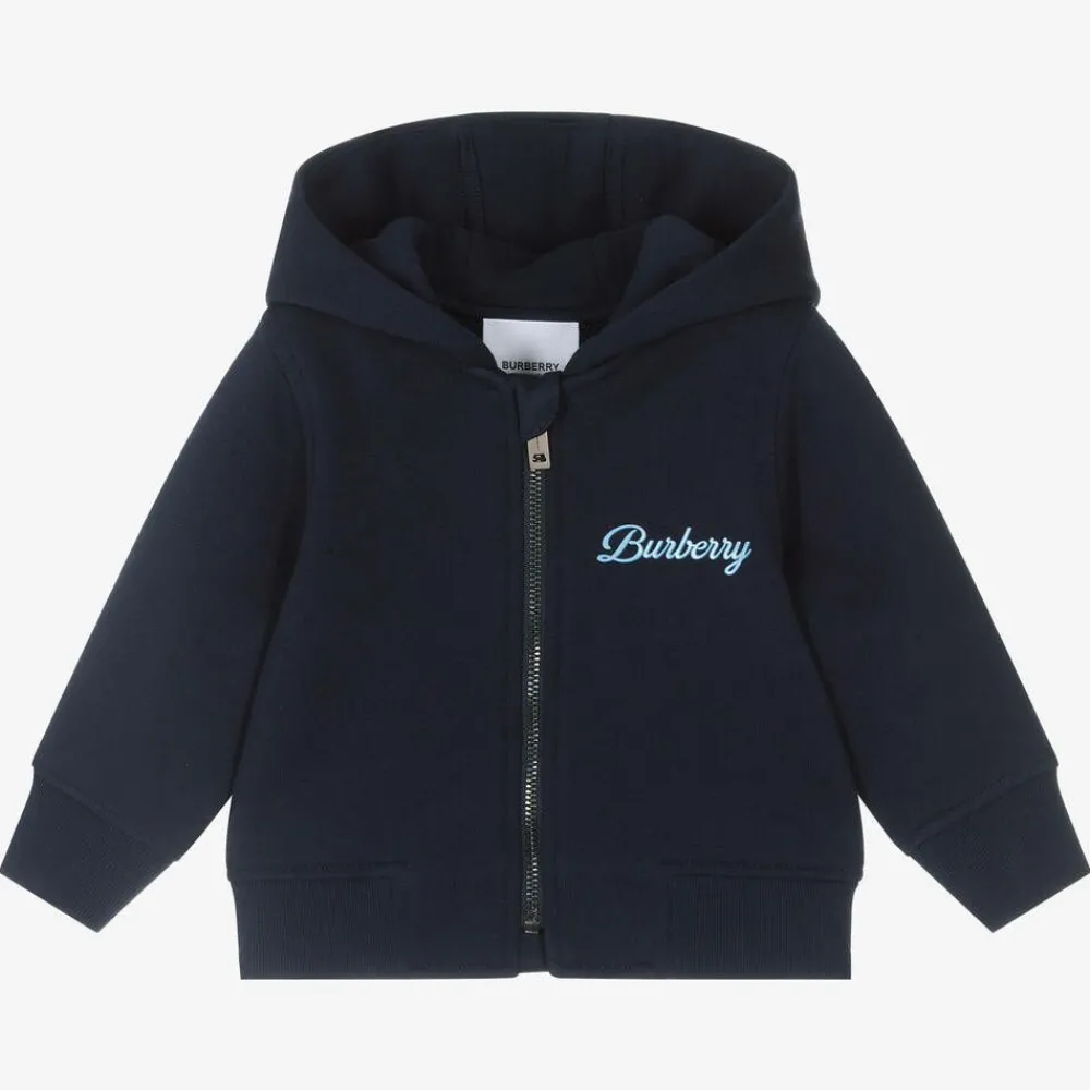Casual and comfy for baby boys, this navy blue zip-up hoodie is by luxury British brand Burberry. Making a bold designer statement, it has a large varsity-inspired logo in two-tone blue on the back, with a smaller matching logo on the chest. Made in soft mid-weight jersey, it has ribbed trims and a branded zip puller. This product contains organic cotton.