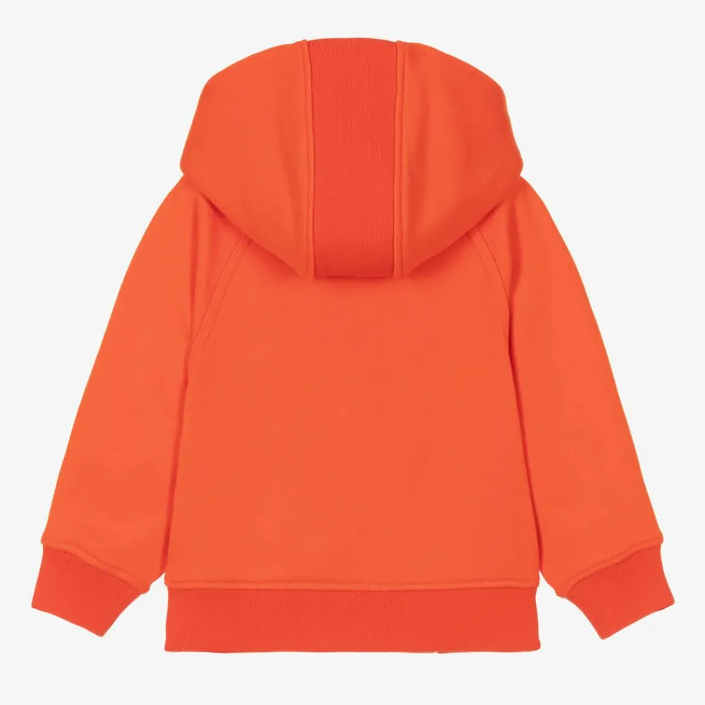Baby boys orange zip-up hoodie by British luxury brand, Burberry. Made in soft cotton sweatshirt jersey, it has the signature Equestrian Knight Design embroidered on the chest in white. Adding vibrancy to casualwear, this bright piece has an embossed silver zip fastening for a subtle, branded finish. It contains organic cotton.