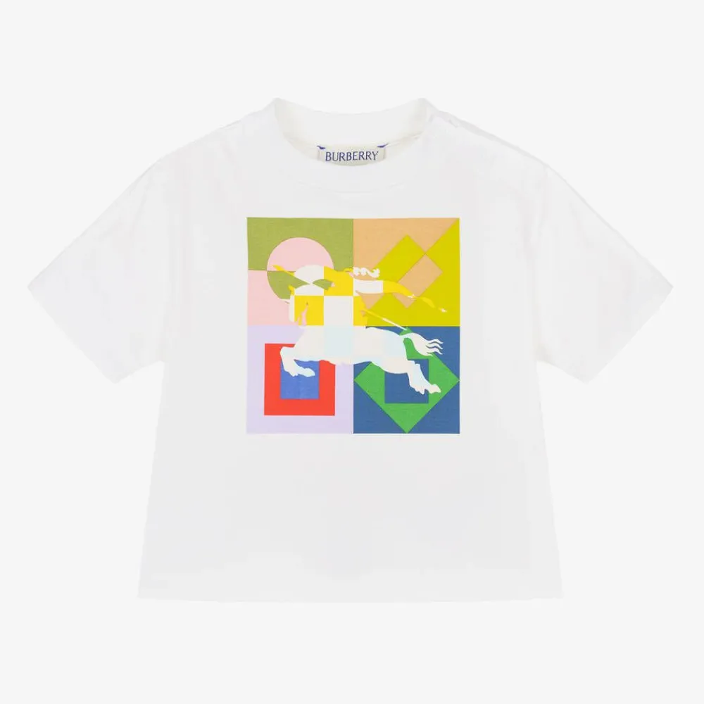 A white T-shirt for baby boys by luxury British brand Burberry, made from soft and stretchy cotton jersey. This distinctive tee features the designer's iconic Equestrian Knight Design in a colourful shape pattern. It has a crew neck and short sleeves, and fastens effortlessly with poppers on one shoulder. This product contains organic cotton.